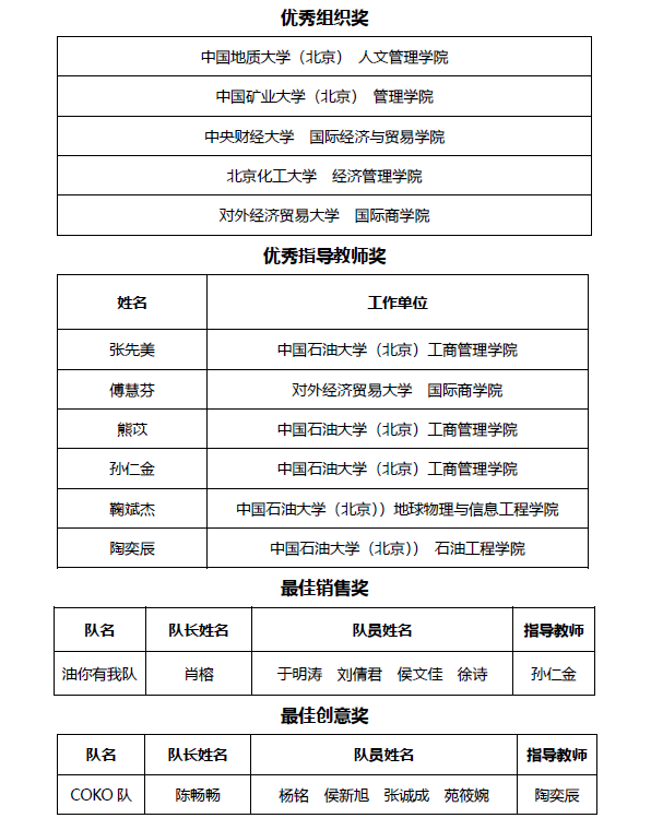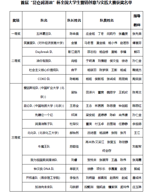 首届“昆仑润滑油”杯全国大学生营销创意与实践大赛获奖名单公示