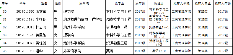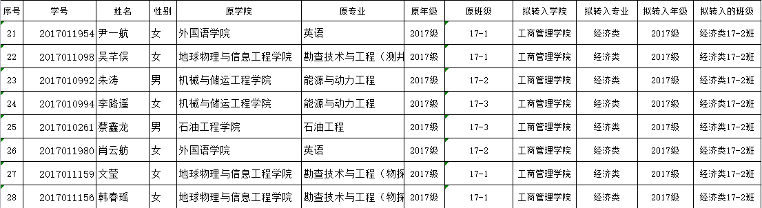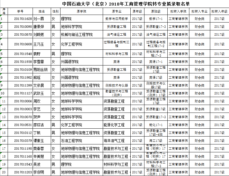 中国石油大学(北京)2018年工商管理学院转专业拟录取名单公示