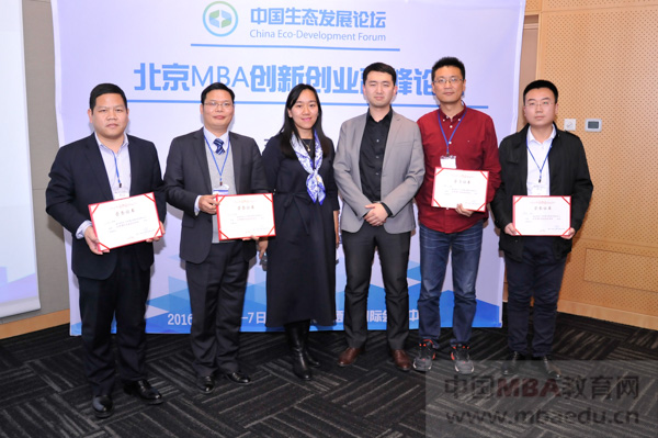 北京MBA联盟执行主席赵一帆为李筱君(右1)颁发优秀MBA校友创业项目奖