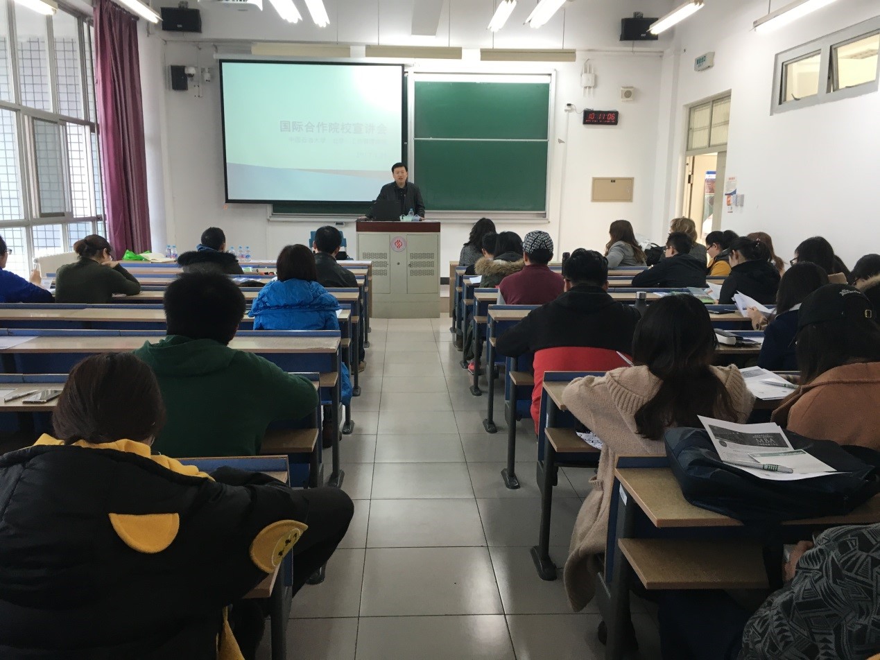 工商管理学院国际化秘书赵叶黎老师向学生们介绍合作院校的详细情况。目前,与工商管理学院达成合作办学的国际院校有4所,包括美国密苏里科技大学、美国扬斯敦州立大学、英国邓迪大学、加拿大新布伦瑞克大学。针对我院本科和研究生有多种学习模式可供选择,包括联合本科生“2+2”,本硕连读“3+2”、联合培养MBA“1+1”项目等。此外,仍有“国家公派优秀本科生短期留学项目”、“SAF海外留学基金会名校交流活动和暑期学术活动”等多种交流项目可满足我院学生各种留学需求。