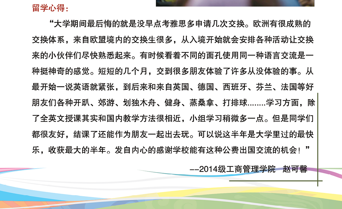 2016-2017年,我院共有7名学生入选公派优秀本科生项目。尽管出国交流项目越来越多样化,但仍有许多成绩优异的学生选择公派项目。除了全额奖学金资助的优惠条件,多数公派学生更是以出国学习经验为跳板,为自己在研究生阶段申请到国际名校做好充分的准备。