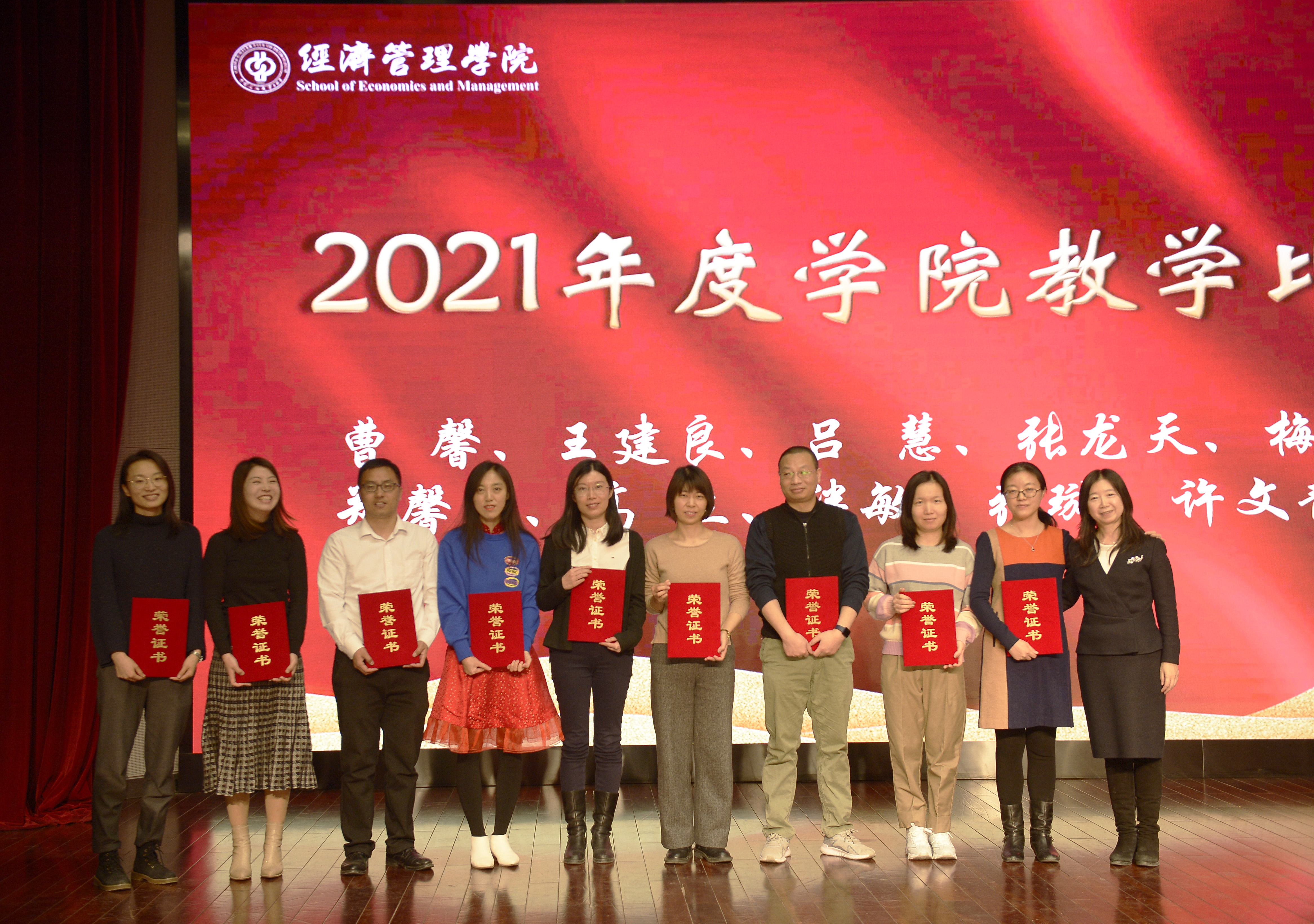 朱义清宣读了关于表彰2021年度经济管理学院各项工作突出贡献奖和贡献奖获得者的决定,对在党建、科研、教学、人才、公共服务、学生工作、工会工作等作出突出贡献和在院内教学比赛中获奖的老师进行表彰并颁发了奖杯和证书,激励全院教职工以先进为榜样,积极进取,开拓创新。