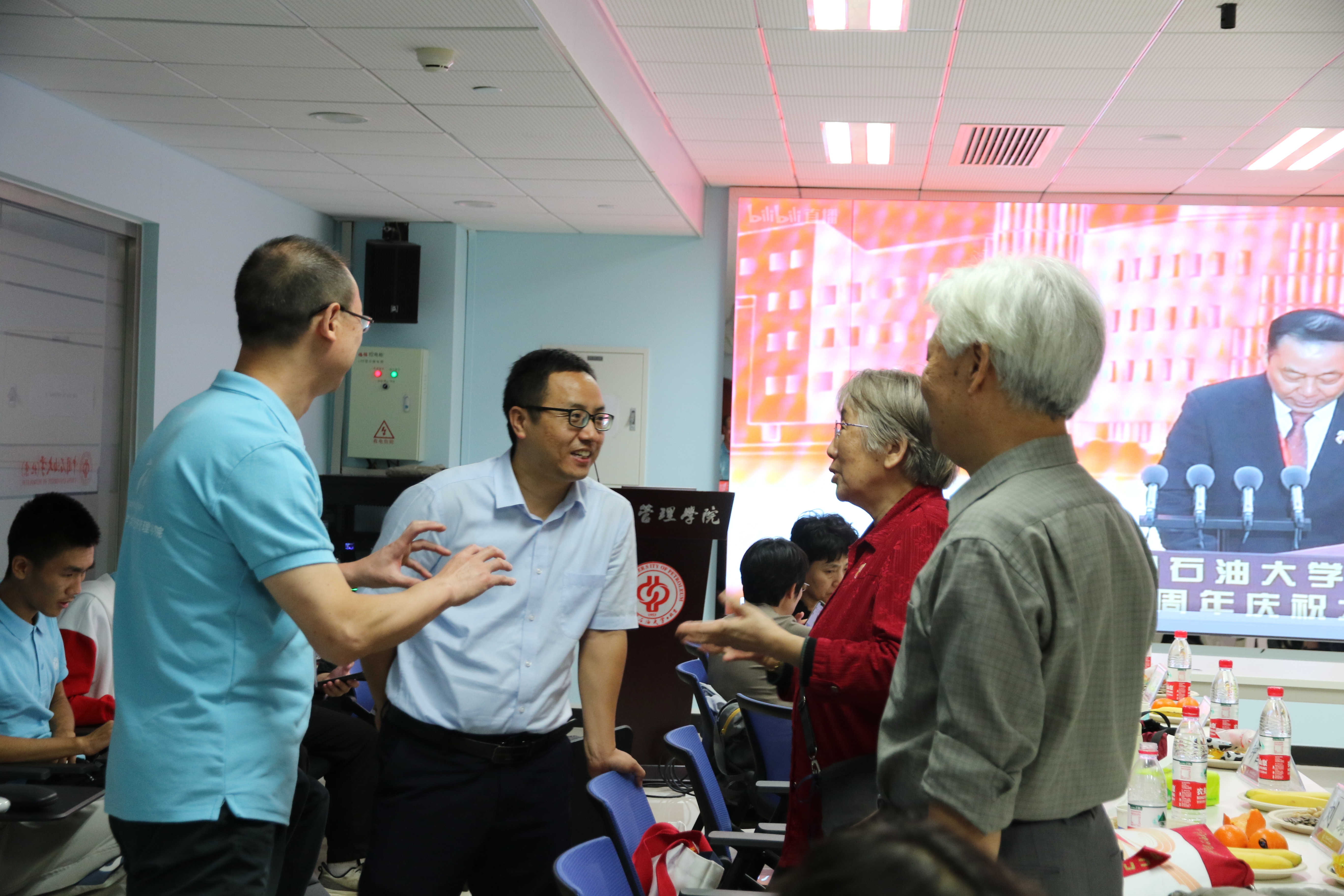 2号上午,李妙兰、杨文慈、钟国晶、穆会珍、陆军、张宝生、邓秀焕、郝洪、回淑玲等退休教师,刘璐、司瑞祺、赵厚学、严振鸣、安彩霞等老校友回归阔别多年的校园,相聚在B1118会议室,与陈大恩、朱义清、马春爱等领导及十余位教师共同观看建校七十周年庆祝大会,共忆难忘的往日时光,共叙求学、工作中结下的美好情谊、共商学院未来发展,为学校七十华诞送上祝福。