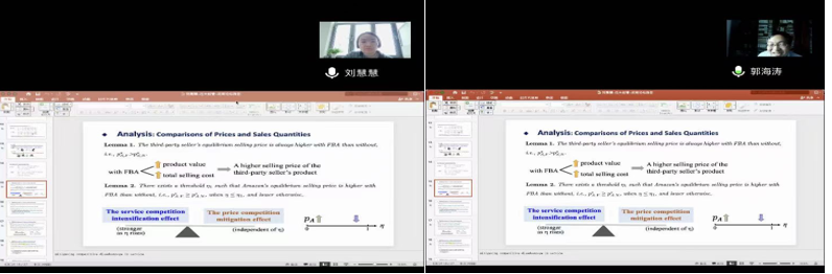 5月12日,经济管理学院“双周论坛”第十九期在线上举行,中国石油大学(北京)经济管理学院副研究员刘慧慧以 "Fulfilled by Amazon" : A Strategic Perspective of Competition at the e-Commerce Platform 为主题开展了讲座。该主题论文发表在管理科学与工程领域顶级期刊《Manufacturing & Service Operations Management》,该期刊属于UT-Dallas24种国际顶级期刊之一。此次报告由应用经济系郭海涛副教授主持,经济管理学院副院长赵晓丽教师及院内外一百多位师生在线参加了讲座;管理科学与工程系宋岑副教授和张璇副教授对讲座内容进行了精彩点评。