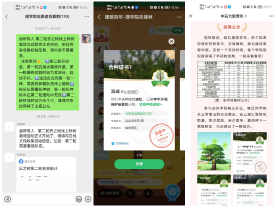 为了保护遭到破坏的生态环境,宣传世界气候大会大力倡导的低碳生活,积极响应习总书记“大力推进生态文明建设”的理念。理学院志愿者组织积极配合校青年志愿者协会开展“云之树,共建石大常青林”线上植树活动,于2021年12月-2022年5月开展“云之树”线上植树活动。受疫情防控条件限制,绿色植树活动以线上活动为主,通过支付宝蚂蚁森林小程序,利用生活中的绿色出行、循环利用、减纸减塑等环保行为积攒绿色能量,为环境保护做出贡献。在理学院志愿者组织的积极宣传与号召下,理学院超300名同学参与了“云之树”线上植树活动,志愿时长超900小时。参与到每支队伍的每位同学都从日常生活的点滴做起,在云端汇集绿色能量,聚沙成塔,积少成多,最终种下一棵棵树苗,为地球添了一抹绿色。