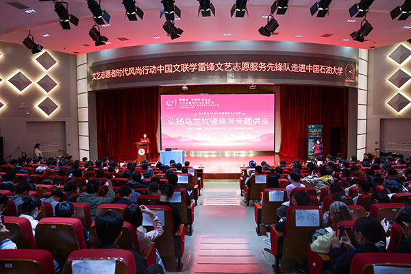 10月21日下午,“学党史 传精神 跟党走 文艺志愿者时代风尚行动”中国文联学雷锋文艺志愿服务先锋队做客中国石油大学(北京)点·石人文系列讲座暨第118期阳光讲坛,宣讲乌兰牧骑精神。中国文联文艺志愿服务中心副主任、中国文艺志愿者协会副秘书长李岩,中国石油大学(北京)副校长金衍,团委、体育与人文艺术学院等部门和学院相关负责人以及300余名师生,现场聆听了蒙古族青年歌唱家、全国学雷锋先进典型“最美志愿者”荣誉称号获得者乌兰图雅带来的精彩报告。
