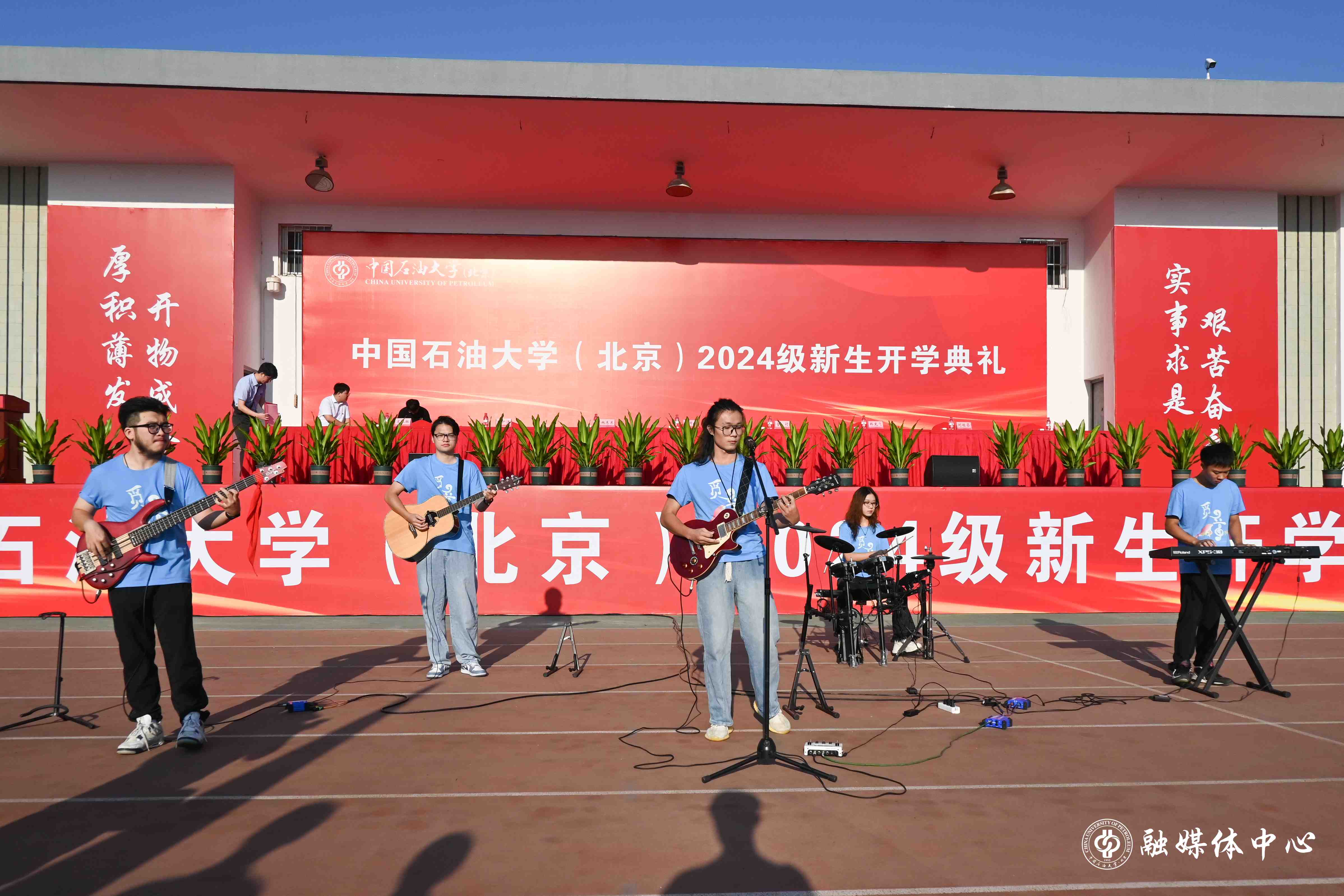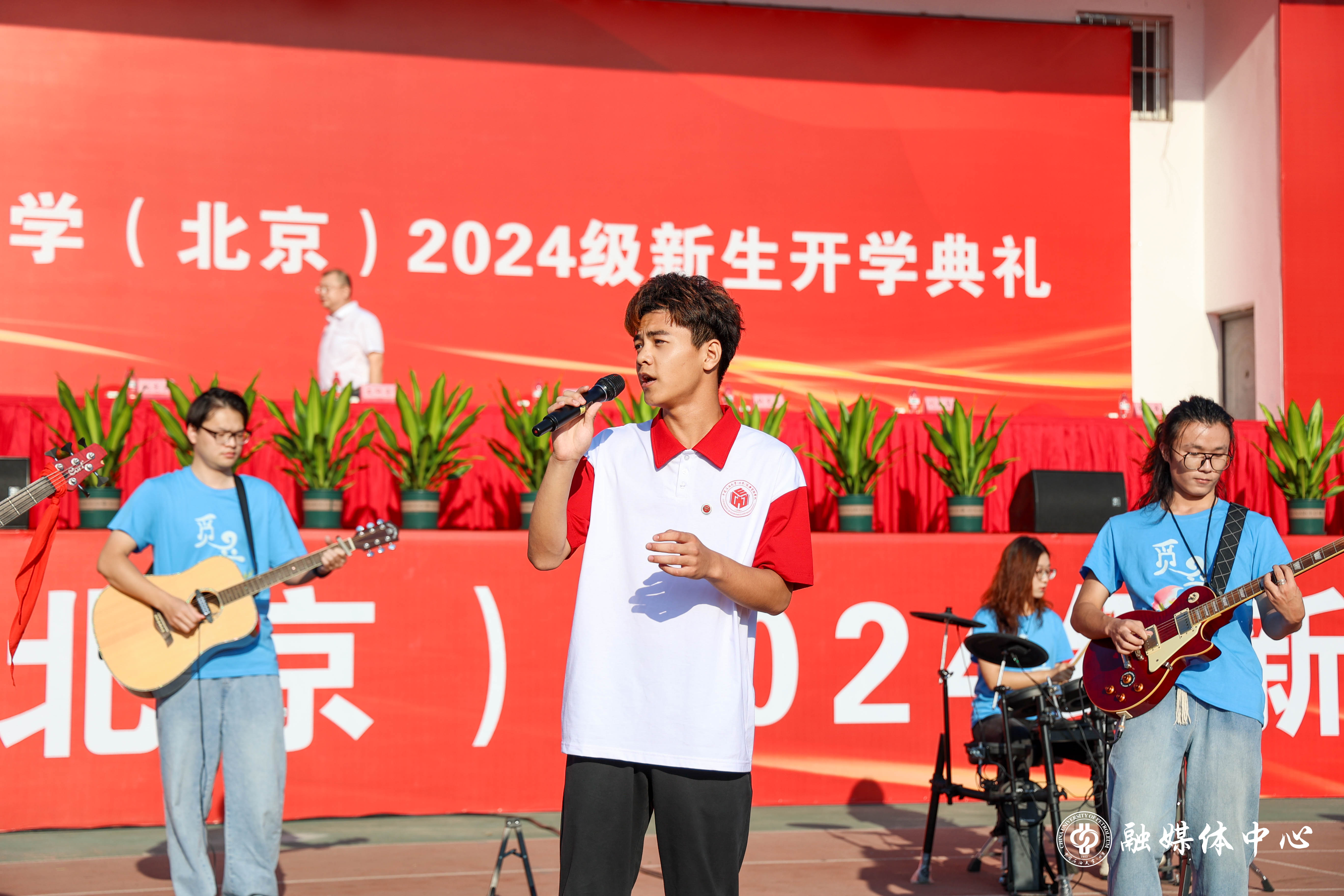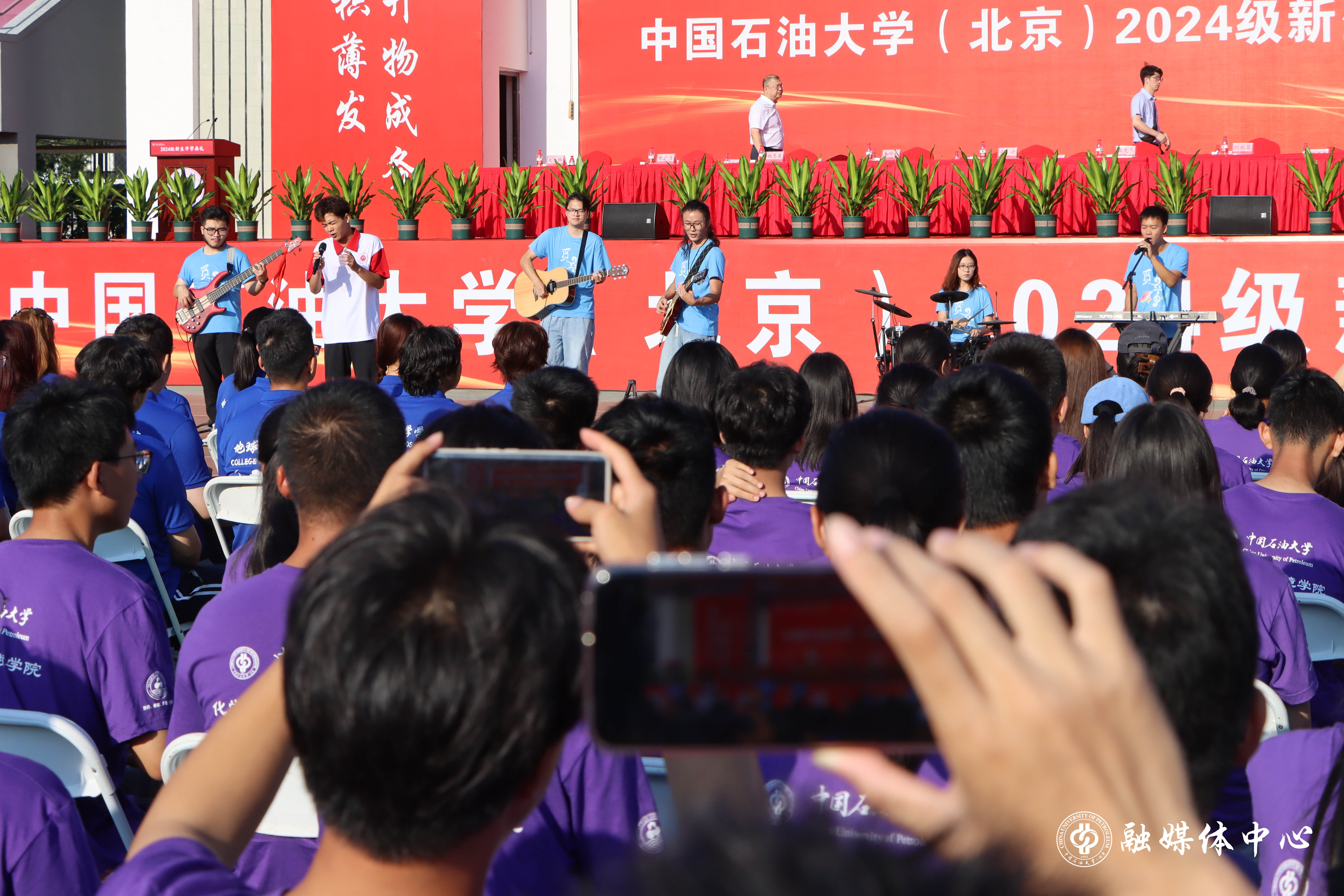 今年的开学典礼设置了暖场表演、新生佩戴校徽、新生入学宣誓等环节。来自中石大觅音社的同学们与新生代表一起,带来了欢快的歌曲串烧表演。