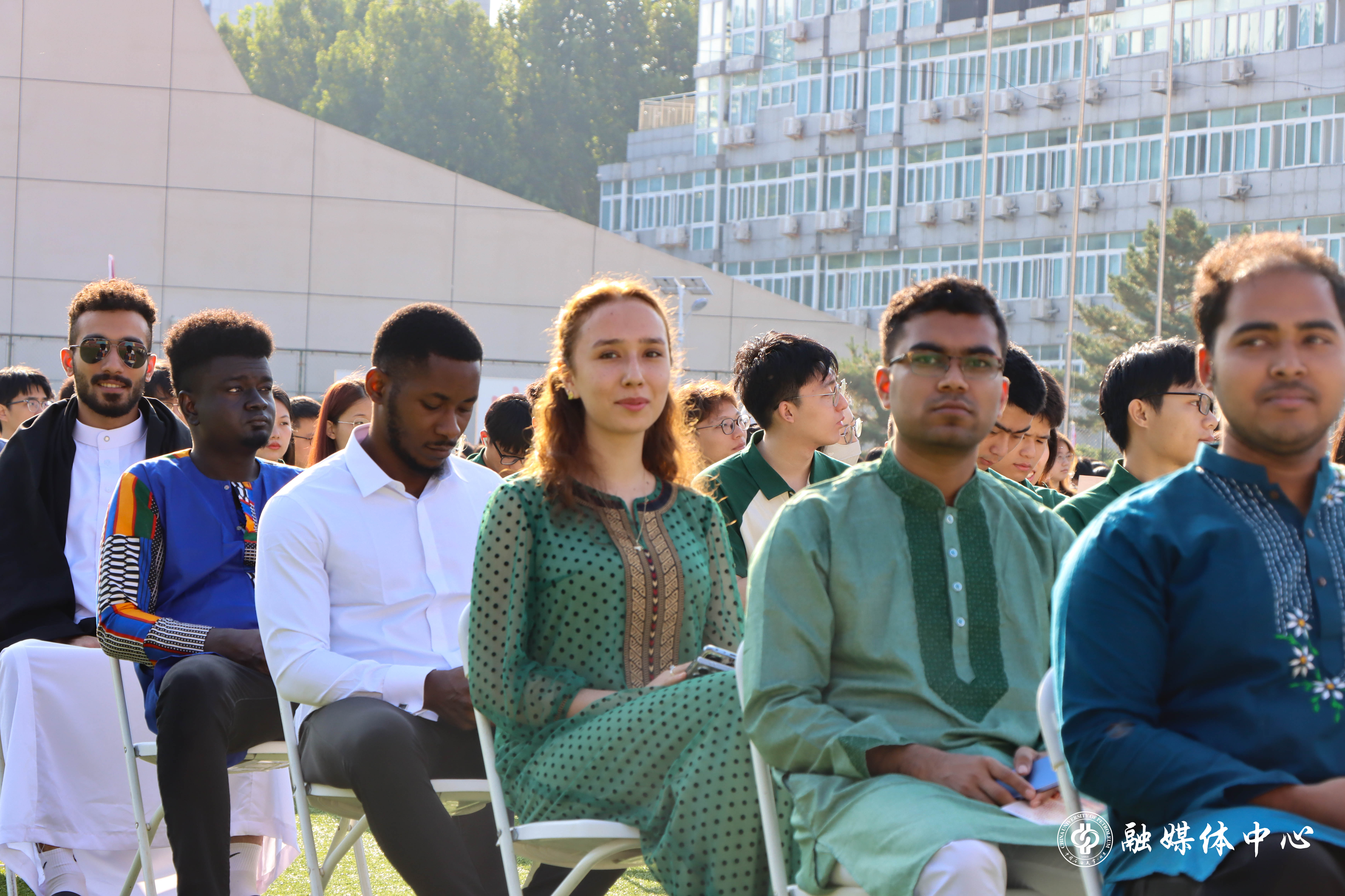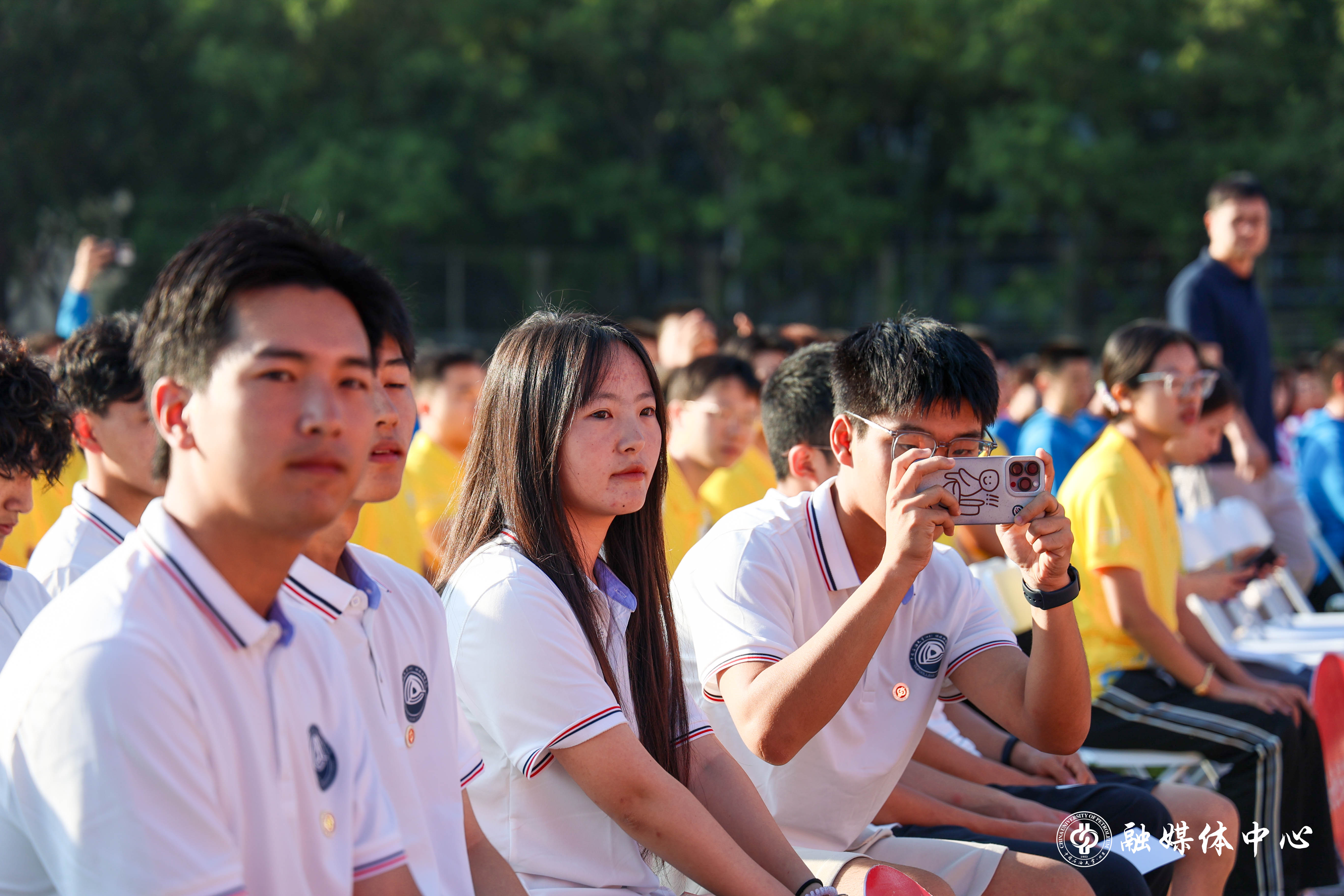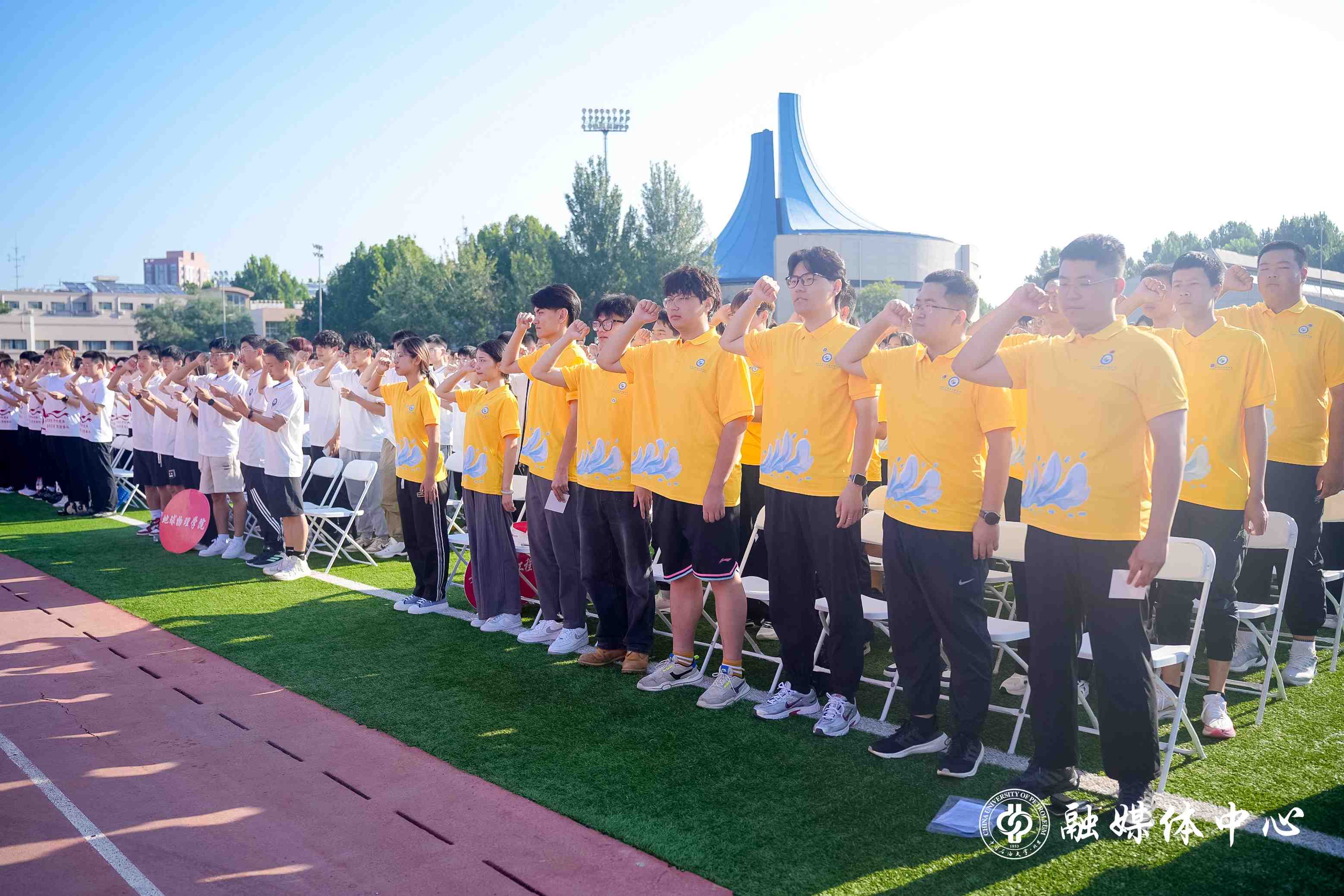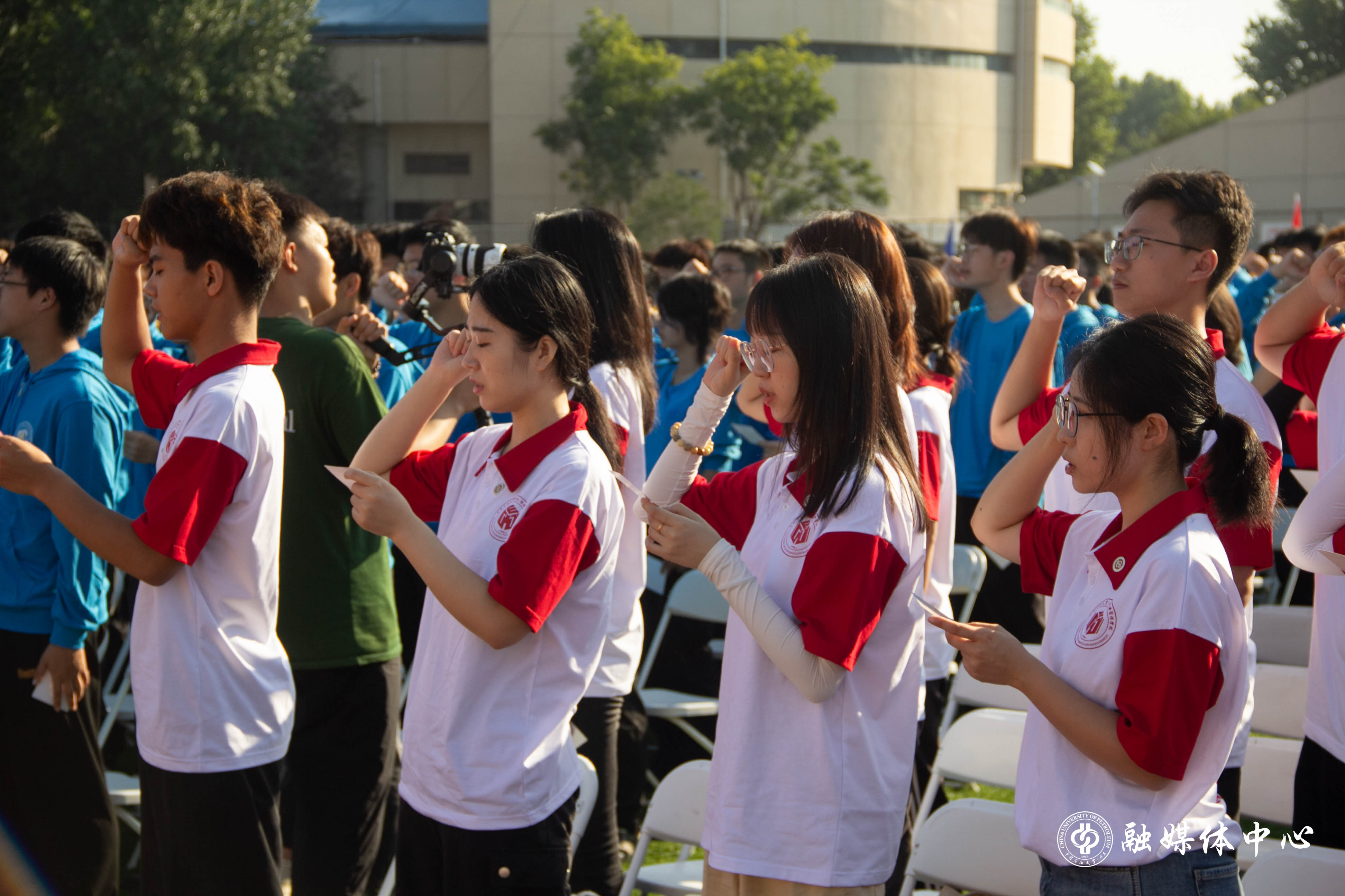 今年的开学典礼设置了暖场表演、新生佩戴校徽、新生入学宣誓等环节。来自中石大觅音社的同学们与新生代表一起,带来了欢快的歌曲串烧表演。