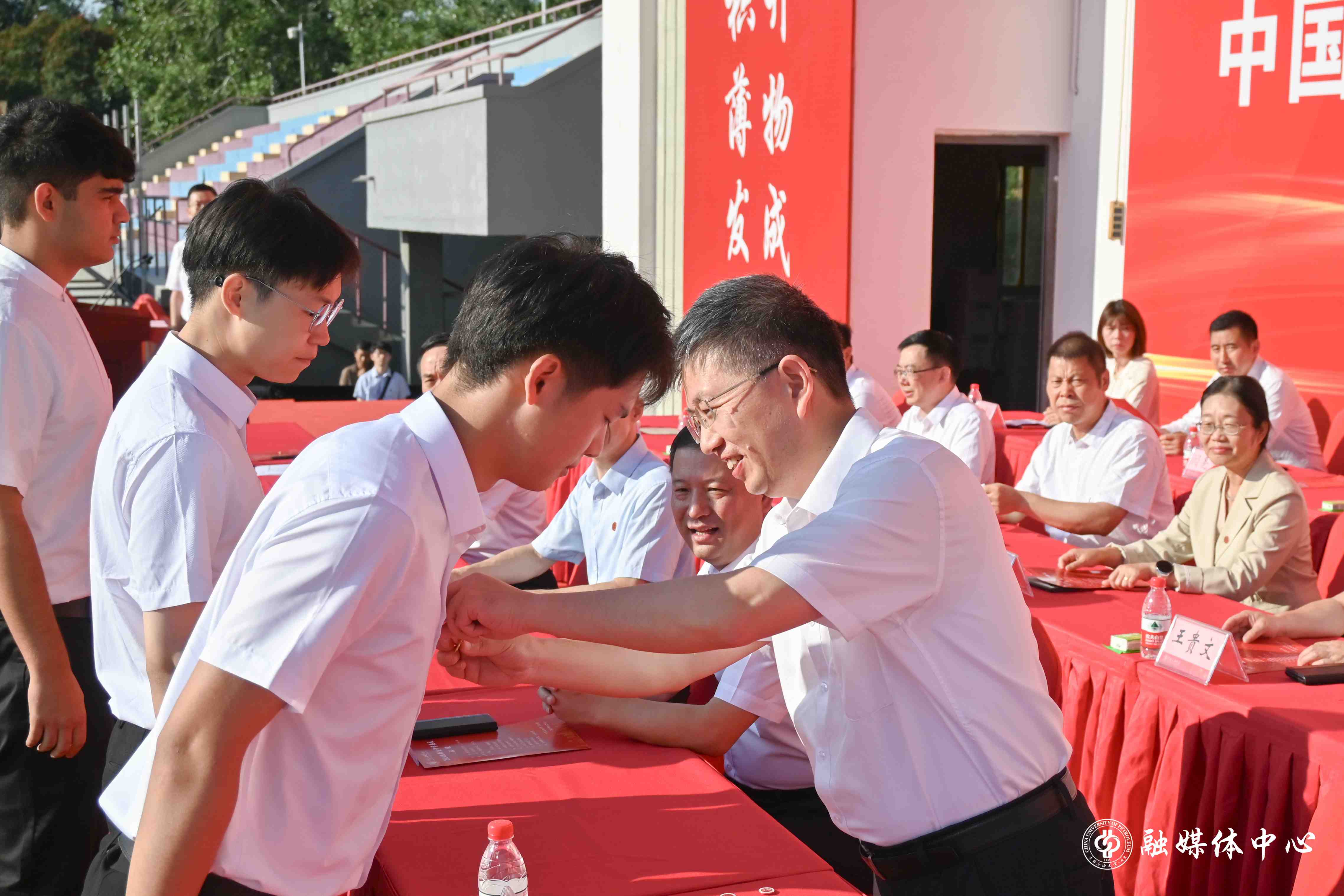 金衍为新生代表们佩戴校徽。新生胸前徽章熠熠闪耀,宣示着又一批青春力量在中石大走上奋进之路、逐梦之旅。