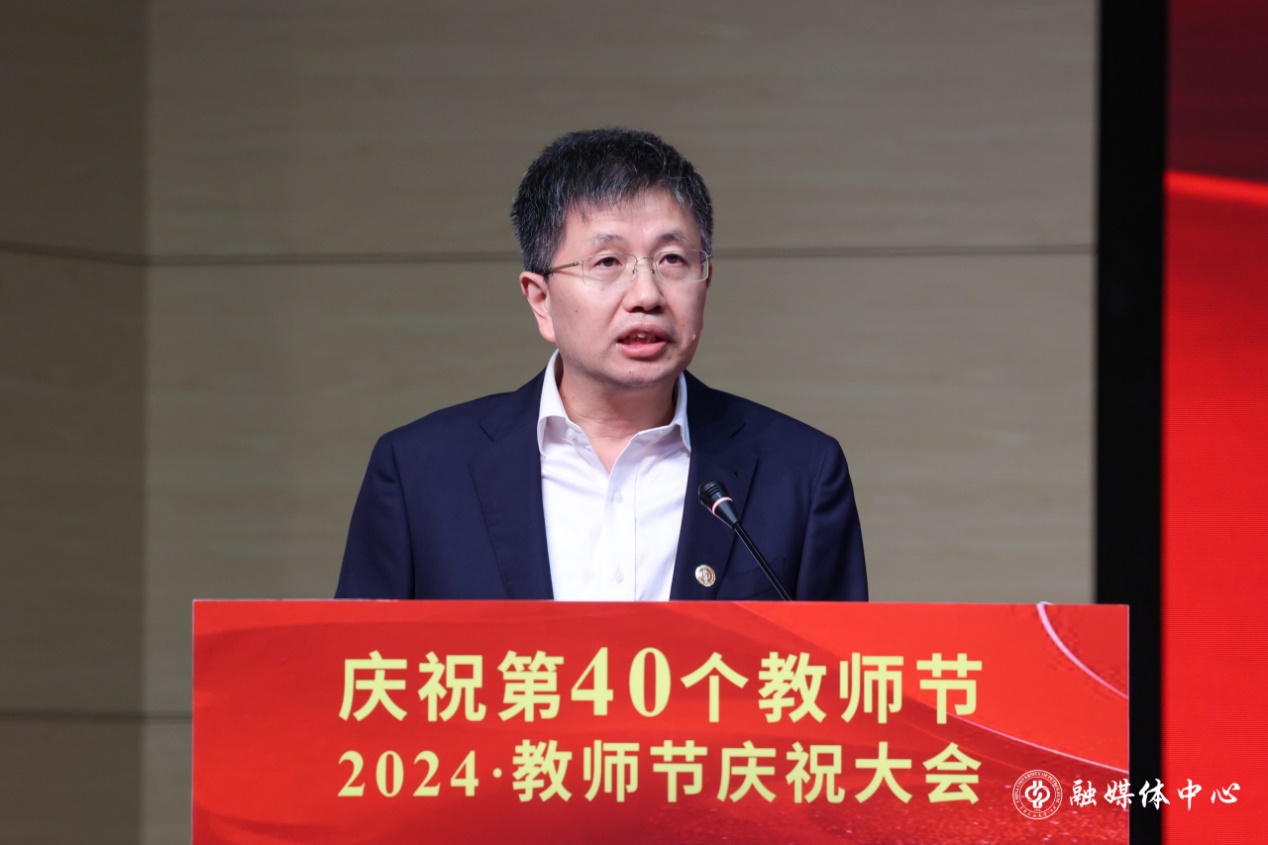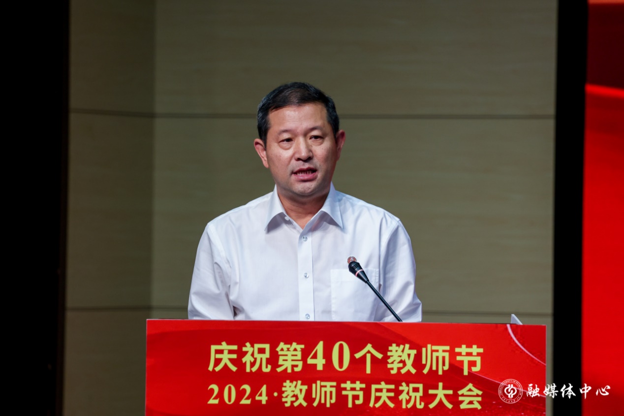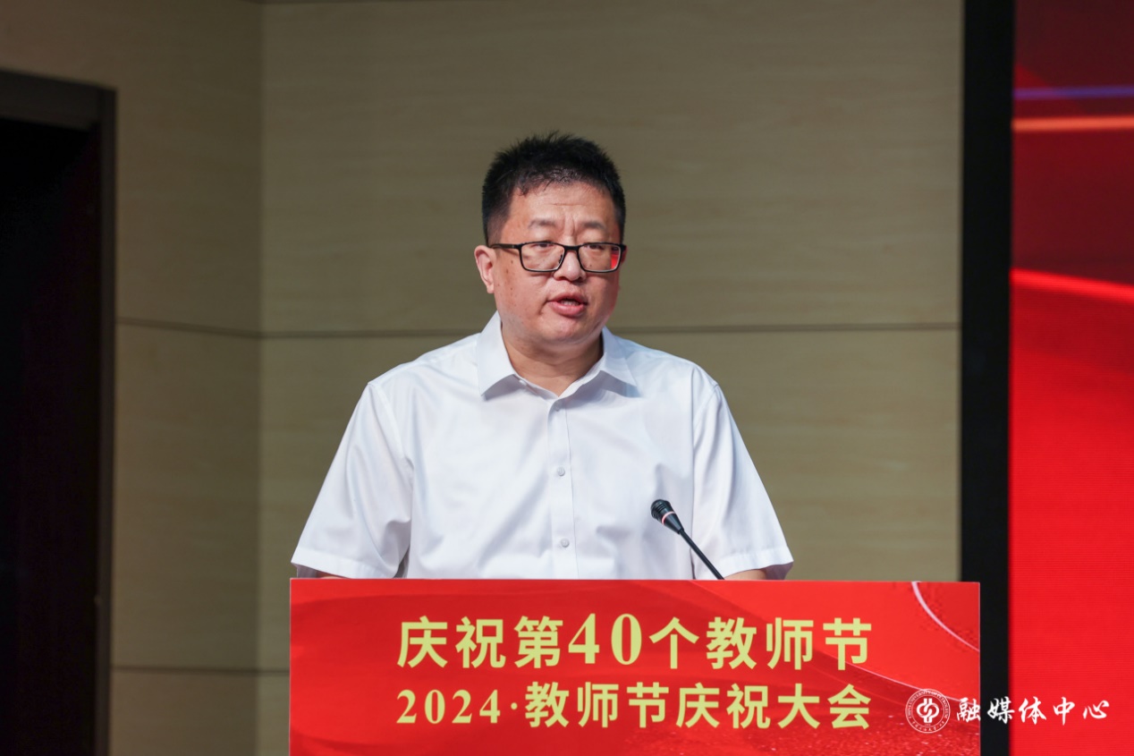 王同奇代表学校党委向全校教师提出了殷切期望。他指出,学校正处于抢抓战略机遇和推动高质量发展关键期,面临时代使命更重、办学空间增大、发展赛道拓宽的新形势。希望广大教师:一是要坚定信念守初心,担当“大使命”。将胸怀天下的价值理想追求与实现中华民族伟大复兴结合起来,将教育家精神融入落实立德树人根本任务,把“躬耕教坛、强国有我”落到实际行动中,强化对青年学生的政治引领、价值引领,确保党的事业和社会主义现代化强国建设后继有人,在至诚报国的“大我”追求中实现个人理想抱负。二是要明德修身长才干,砥砺“大德行”。要自觉砥砺品行、用优良德行,树立教师的崇高形象,引导学生走好成长的每一步。要苦练育人本领,树立终身学习的理念,以使自己拥有源源不断的力量源泉,时刻为学生提供鲜活的成长清泉。三是要躬体力行勇担当,展现“大作为”。站在知识发展前沿,遵循教育规律和人才成长规律,在潜心教书育人、勇攀学术高峰、弘扬人间正道上彰显担当、展现作为,在推动学校事业高质量发展的新征程上开拓新路、再创佳绩。