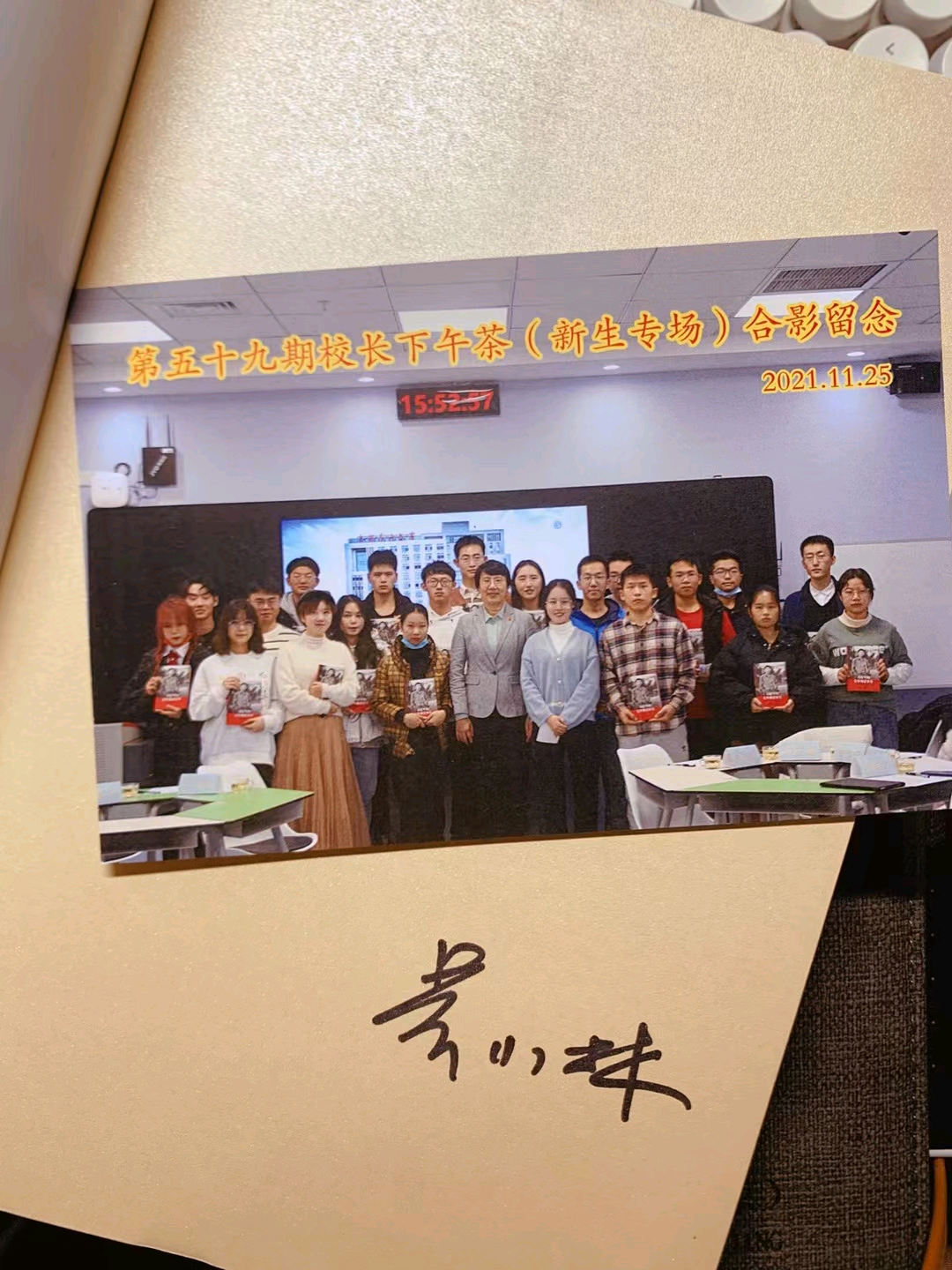 吴小林把《习近平的七年知青岁月》一书作为礼物送给同学们,希望大家从中体悟习近平总书记青年时矢志不渝的理想追求和爱国为民的家国情怀。同学们把自己军训的相片作成相册送给吴小林,表示要以“我自扬鞭策骏马,不负今朝少年时”的壮满豪情奔赴未来。