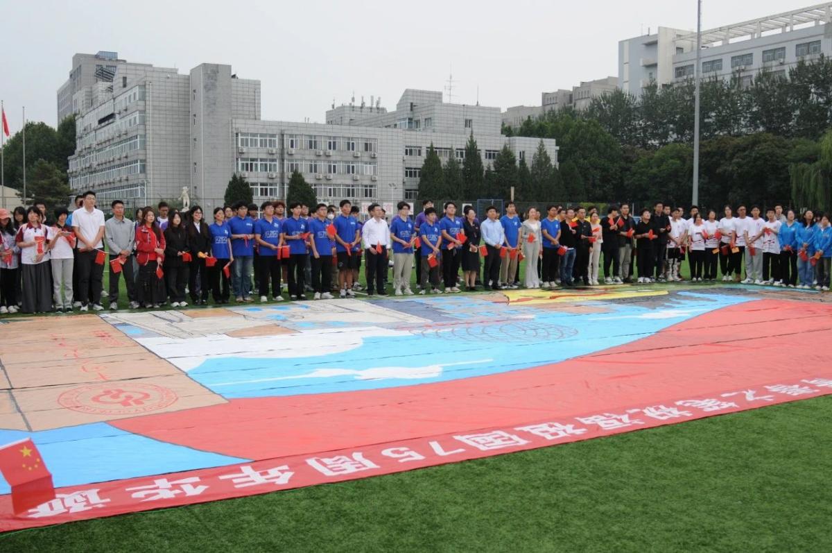 校团委组织200余名青年师生齐聚红旗操场,以青春之笔共同绘就“为国而生 与国同行”巨幅画卷,活动中,中石大建校70周年校庆日在天安门广场升起的五星红旗在学校国旗仪仗队的护送下,首度亮相红旗操场,全场师生面向国旗举起右拳庄严宣誓:不忘初心、牢记使命,自信自强、刚健有为,胸怀国之大者,矢志能源报国,奋力书写为中国式现代化挺膺担当的青春篇章。教育部官微“微言教育”对活动进行了报道。