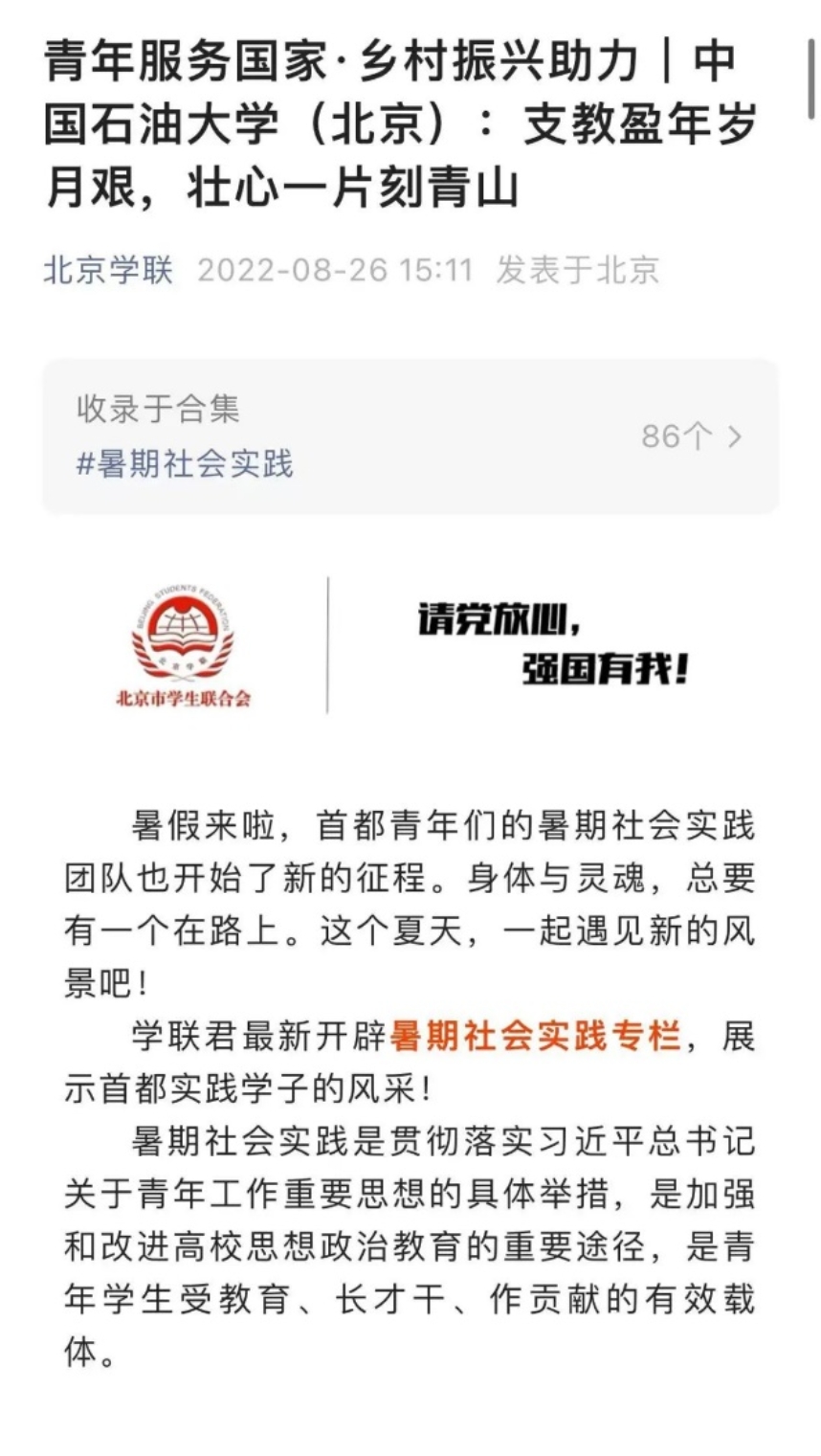 团支部成立两个社会实践小组“无字之书”对于大学生来说也是不可或缺的,团支部也注重团员们综合素质的培养,积极组织社会实践活动,逐渐建立长久性的服务项目,为社会做出自己的贡献。团支部积极组织开展社会实践活动,参与率高达100%,为此成立了两个专题实践小组。其中“支教盈年岁月艰,壮心一片刻青山”支教活动面向9个年级170余学生开展教学工作。相关推送信息被今日头条、百度新闻、北京学联、腾讯新闻等新闻媒体报道10余次,各平台阅读量达10000+,累计推送20余篇,并在校团委展板区展示。