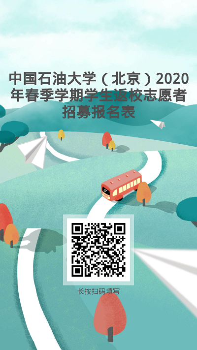 扫码填写《中国石油大学(北京)春季学期学生返校志愿者报名表》,请于5月29日12点前提交。