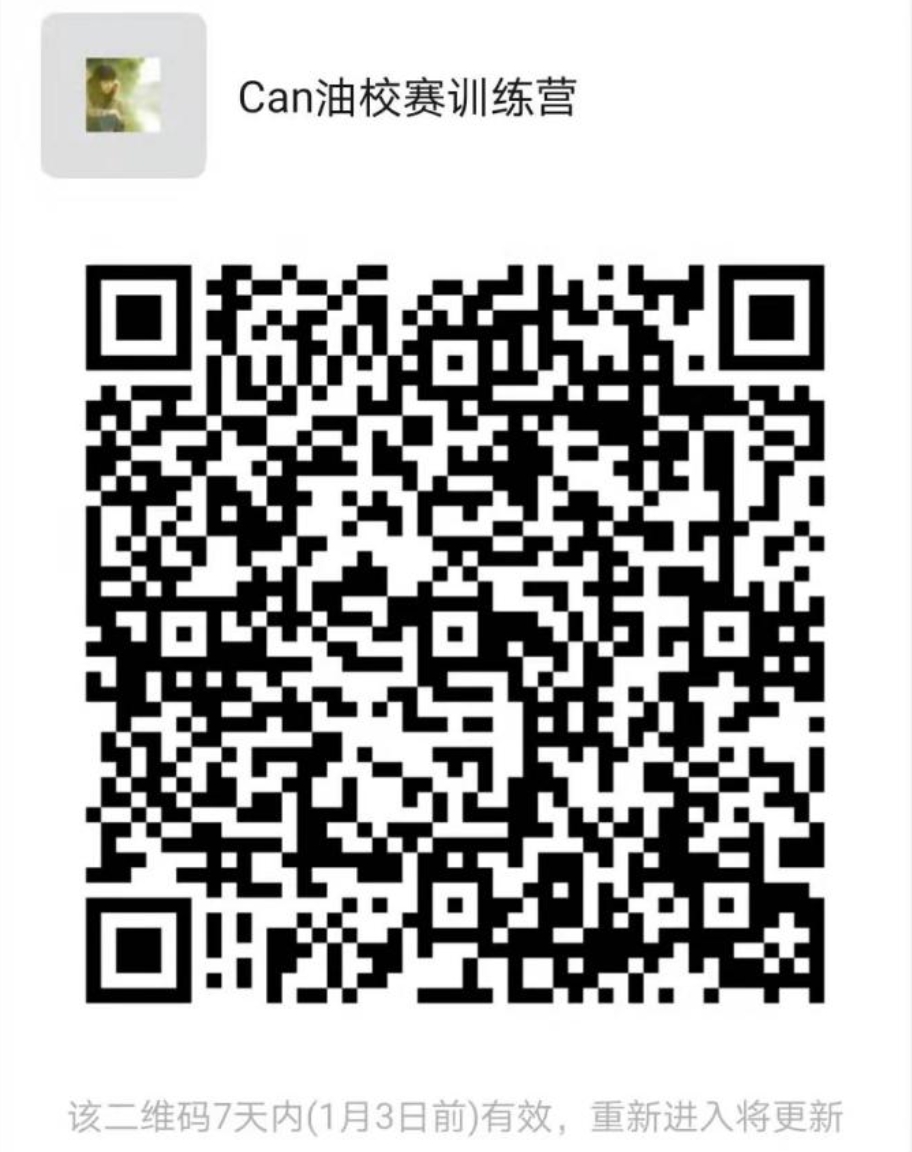 学校将重点关注成绩排名前三十的项目小组,成绩排名前六十的项目小组进入Can油校赛训练营,请成绩排名前六十的项目负责人扫码进群(见图1)并更改备注为“成绩排名+姓名”以便后续交流。请加入训练营的队伍认真对待,后续将根据队伍的实际能力及态度逐步筛选择优。