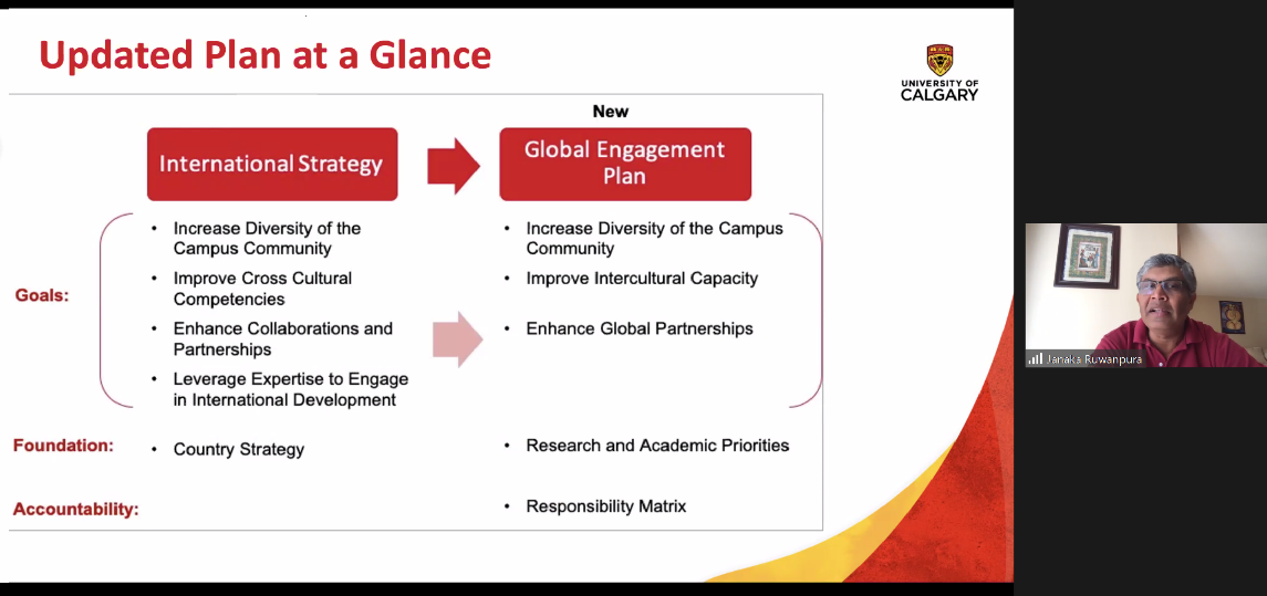 在双方近期国际交流工作进展方面,卡尔加里大学介绍了该校2020-2025的规划目标,包括增加校园多样性、提升跨文化能力和加强全球伙伴关系等。我校国际处介绍了中石大近年来取得的重要进展,包括在学校和学科排名、国际联合实验室、高层次人才队伍等方面的新进展,以及中石油战略合作项目、新增学生交流项目及世界能源大学联盟线上会议等。在重点合作领域方面,卡尔加里大学希望重点开展研究生及科研领域合作。我校国际处则介绍了学校鼓励青年教师国际合作、与国外知名大学联合培养博士生和联合办学项目,以及开展短期留学项目等多项举措。在学生合作项目方面,卡尔加里大学表示将会继续推进双学位学生项目,并促成多位包括克拉玛依校区在内的石大学子出国项目的成功申请等。我校则会继续支持长短期学生联合培养项目的开展。