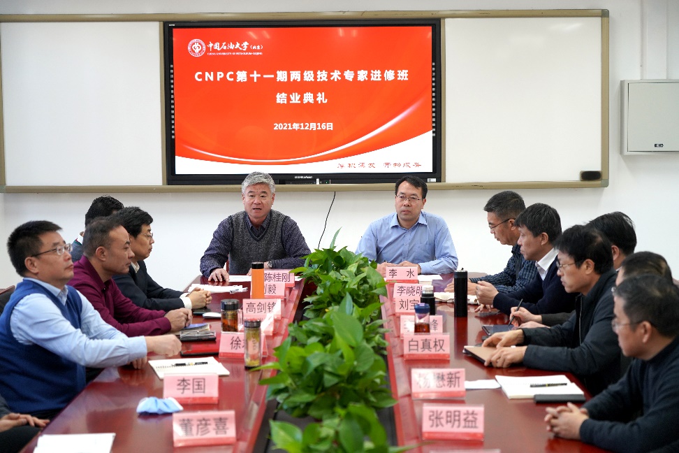 2021年12月16日,由中国石油大学(北京)网络与继续教育学院承办的“中国石油天然气集团有限公司第十一期两级技术专家进修班”在东教楼802举行结业典礼,中国石油大学(北京)网络与继续教育学院院长陈桂刚出席结业典礼并讲话,结业典礼由网络与继续教育学院副院长李水主持。