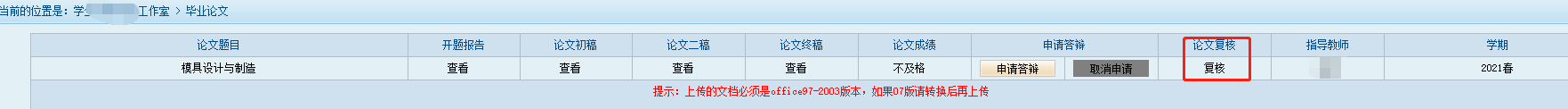 没有给出及格成绩的学生根据教师建议修改论文后在复核界面再次提交。 |