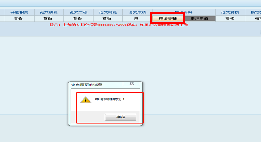 进入学生工作室—毕业论文—论文操作模块,点击申请答辩,申请成功后会出现申请答辩成功的对话框,见下图。在此期间可申请取消答辩,逾期将无法进行申请或取消申请。