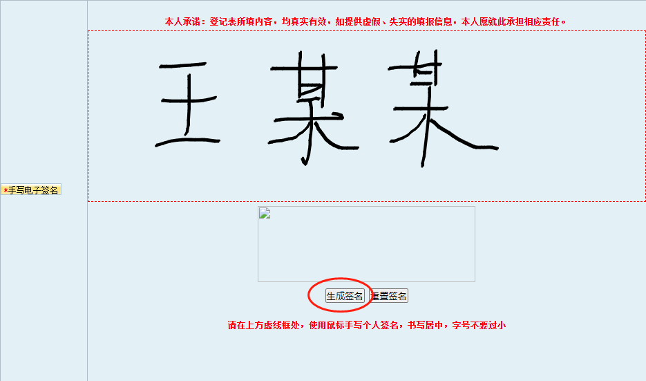 电子签名在红框内左右居中,上下占满空间,无需抄写个人承诺;在签写本人姓名后,请务必点击“生成签名”按钮;如需重签,点击“重置签名”后,重新签字并生成签名。