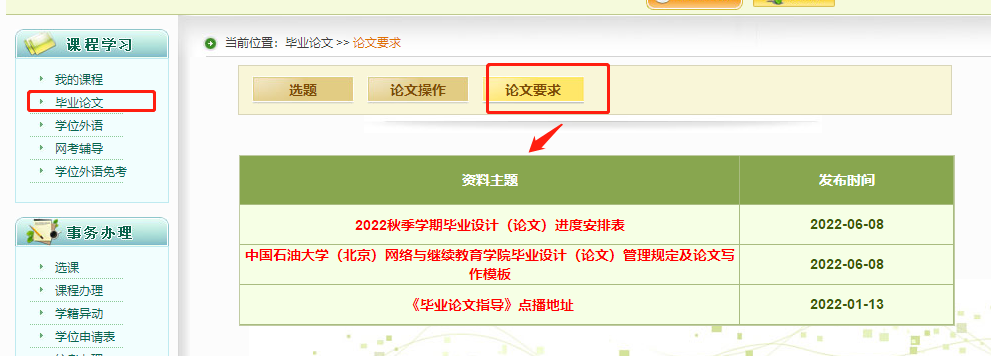 2.毕业设计(论文)管理规定、写作模板、写作指导等,可在“学生工作室→毕业论文→论文要求”栏目中查看。毕业设计(论文)管理规定和写作模板也可参看附件2。