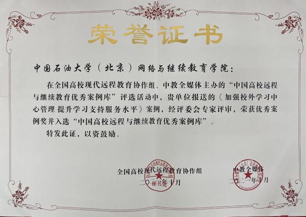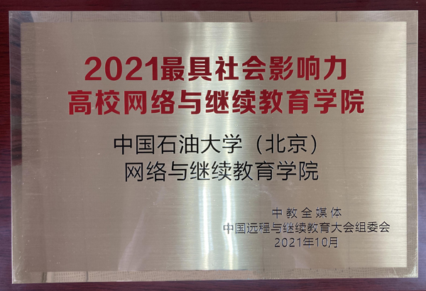 为更好推动我国网络与继续教育事业的蓬勃发展,发挥优秀院校的榜样作用和影响力,推广网络与继续教育典型经验和案例,大会举行了相关项目的颁奖仪式。我院荣获“2021最具社会影响力高校网络与继续教育学院”奖;我院报送的《加强校外学习中心管理 提升学习支持服务水平》案例荣获优秀案例奖并入选“中国高校远程与继续教育优秀案例库”;我校远程教育北京石油化工学院学习中心、长沙学习中心被评为“2021年度中国高校现代远程教育优秀校外学习中心”。