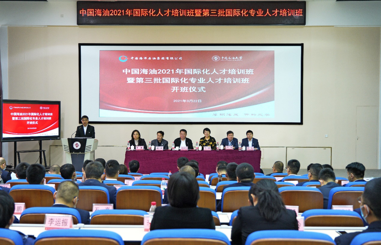 2021年3月22日,由我校网络与继续教育学院承办的“中国海油2021年国际化人才培训班暨第三批国际化专业人才培训班”在第四教学楼401隆重开班。中国海洋石油有限公司执行副总裁,中国海洋石油国际有限公司董事长、党委书记,集团公司海外企业党工委书记夏庆龙,中国石油大学(北京)校长、党委副书记吴小林出席开班并讲话。开班仪式由中国海油党组组织部副部长、人力资源部副总经理戴照辉主持。中国石油大学(北京)校长助理金衍,中国海油国际有限公司党委组织部部长、人力资源部经理李燕,中国石油大学(北京)网络与继续教育学院院长陈崇河,中国海油人力资源部人才开发处副处长胡航也参加了开班仪式。