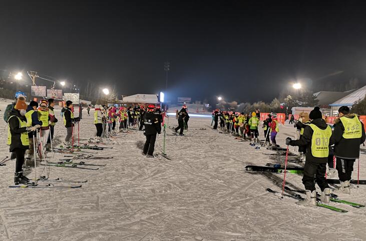 本项目为期两天,每名教师均配备了一套滑雪器材,并且可以使用缆车、魔毯、拖牵及雪道,并为学员配备了八名教练,基本满足初学者要求。八名教练从如何在雪地前进,如何刹车和摔倒时如何最大限度保护身体几方面进行讲解,并带领学员乘坐魔毯,在练习道分段守护学员并且随时进行指导。北京军都山滑雪场配备了超大功率的专业照明系统,使夜场滑雪者笼罩在浓浓的橘黄色的氛围之中。所有教师无惧严寒,以极大的热情参加了本项目。