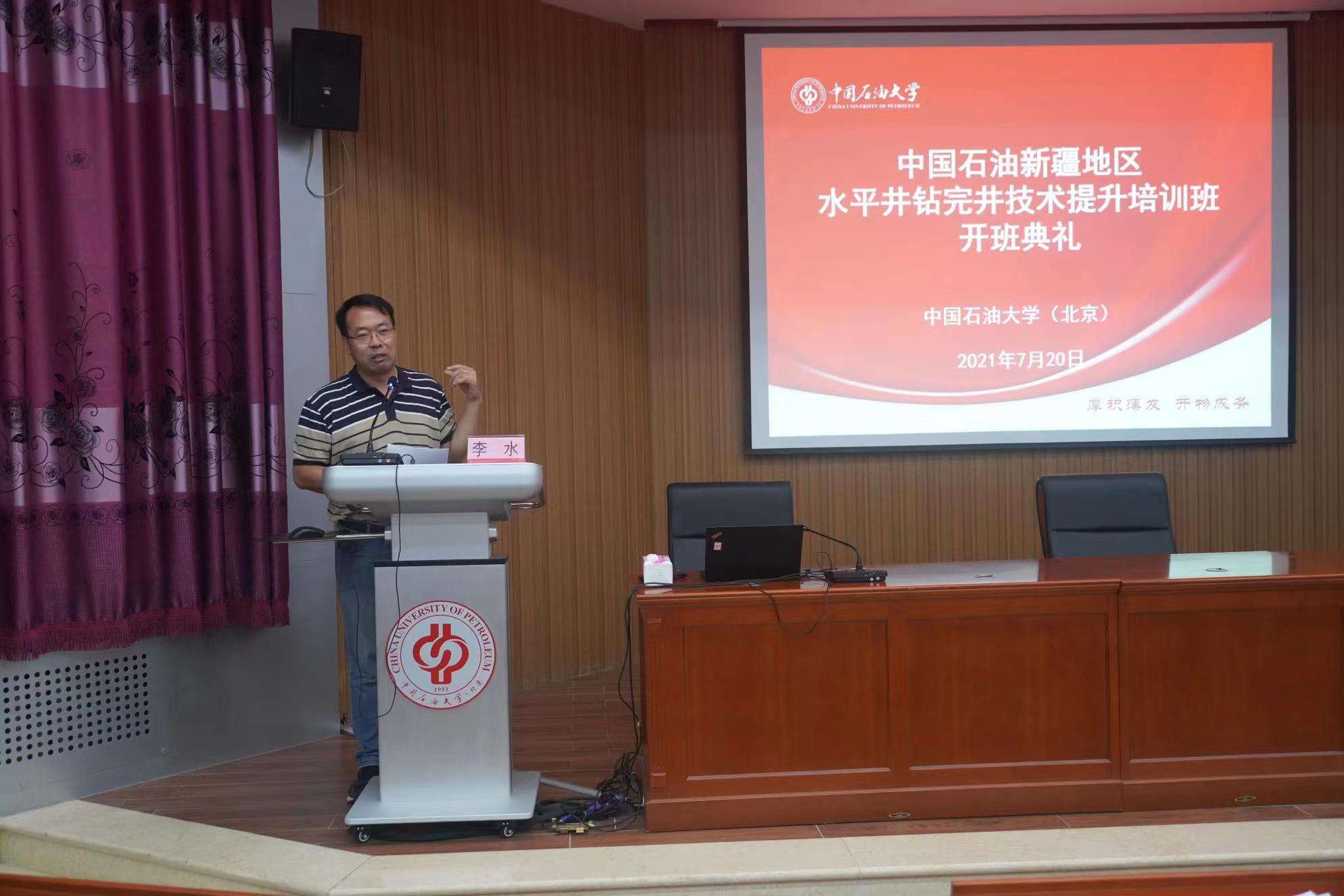 2021年7月20日,由我校网络与继续教育学院承办的“中国石油新疆地区水平井钻完井技术提升培训班”在东校园培训基地第一报告厅隆重开班。中国石油大学(北京)网络与继续教育学院副院长李水出席开班典礼并讲话,开班典礼由中国石油大学(北京)网络与继续教育学院高端培训中心主任董刚主持。