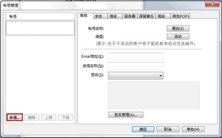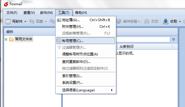 常见问题 首页» 常见问题» 邮箱相关 邮箱相关 【常见问题】如何在FoxMail中新建邮件账户? 来源:信息技术中心 发布日期: 2013-03-06 阅读次数: 第一步: 打开Foxmail,进入“工具”—“账号管理”: 点击左下角“新建”: 输入需要配置的邮箱: 若此处接收服务器端口配置不正确,可以在“工具”—“账号管理”—“服务器”中修改: