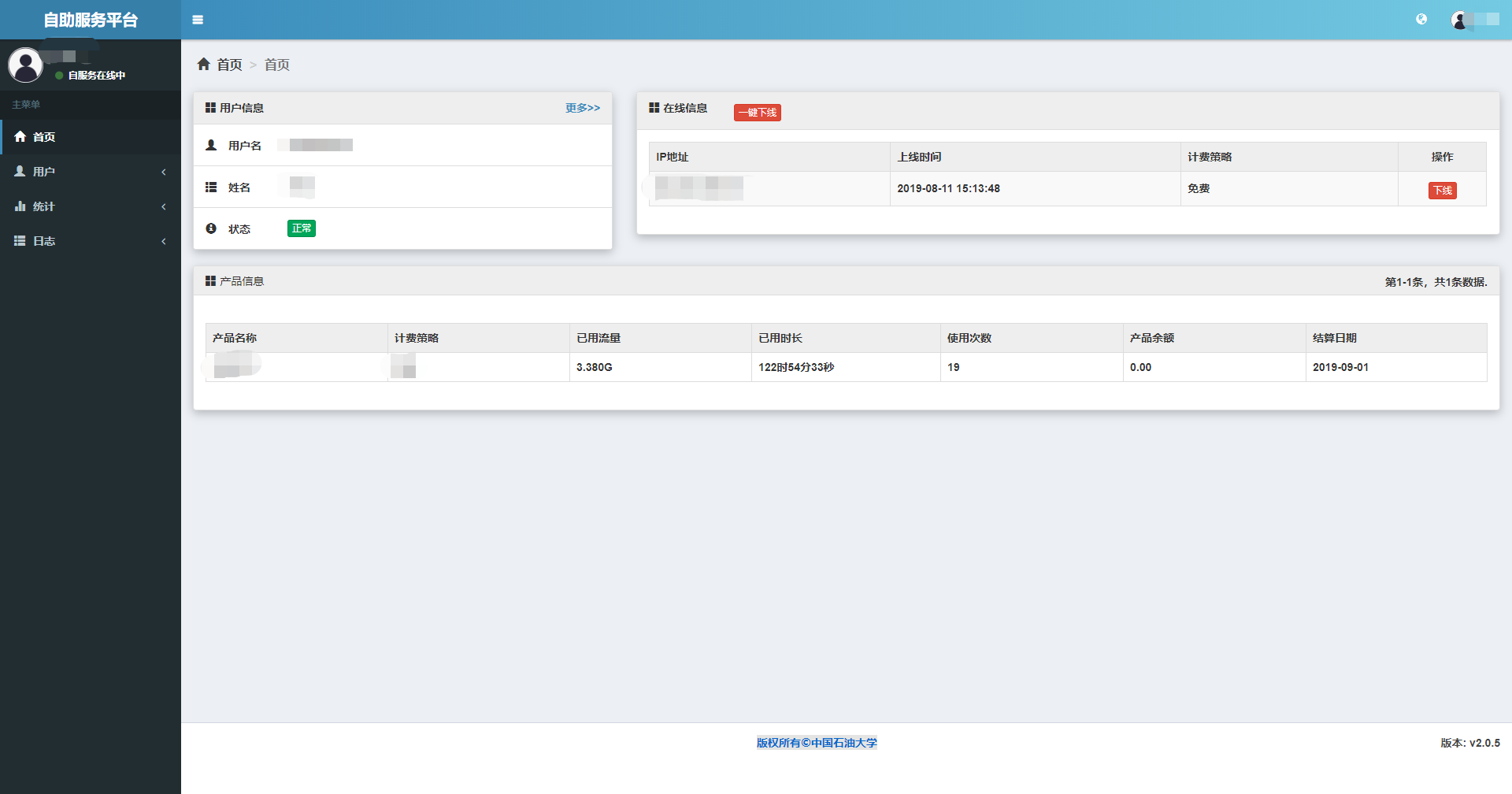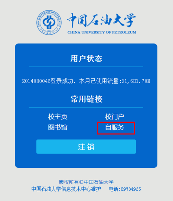 在地址栏输入网址:http://login.cup.edu.cn,选择认证界面中的“自助服务”或“自服务”字样,输入网络账号密码,即可使用该服务功能。