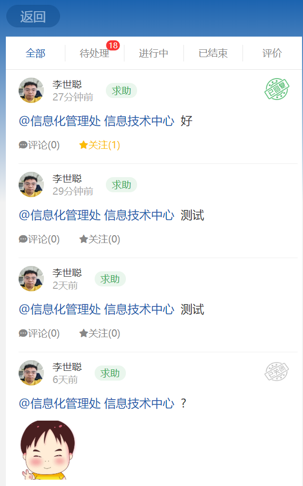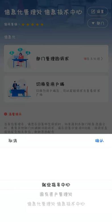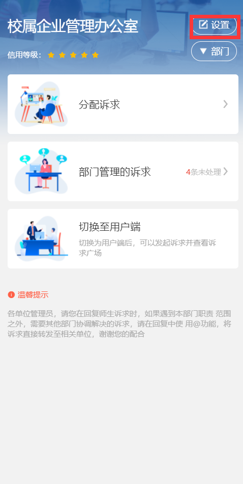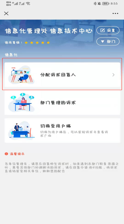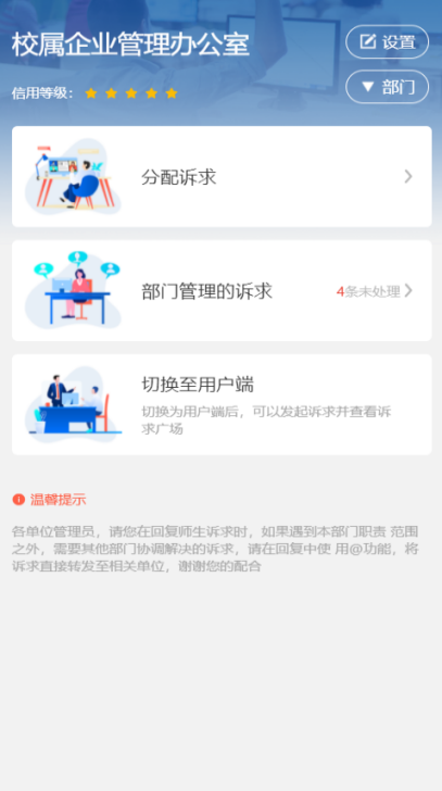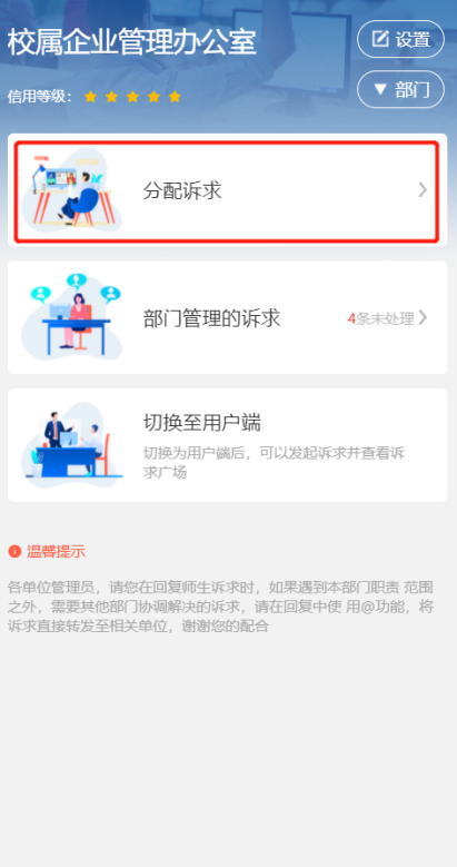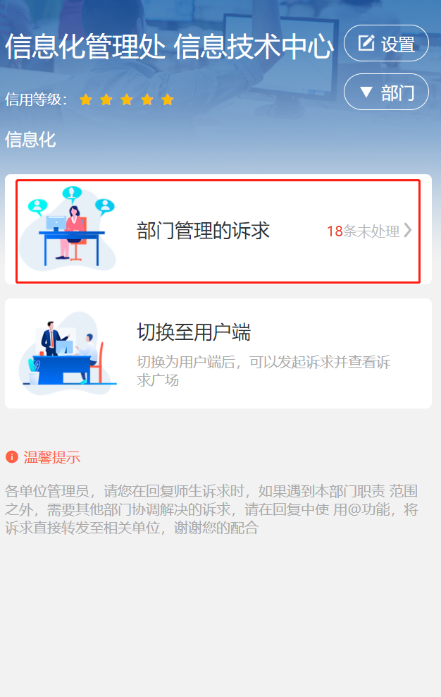 点击【部门管理的诉求】即可查看待处理、进行中、已结束和用户评价