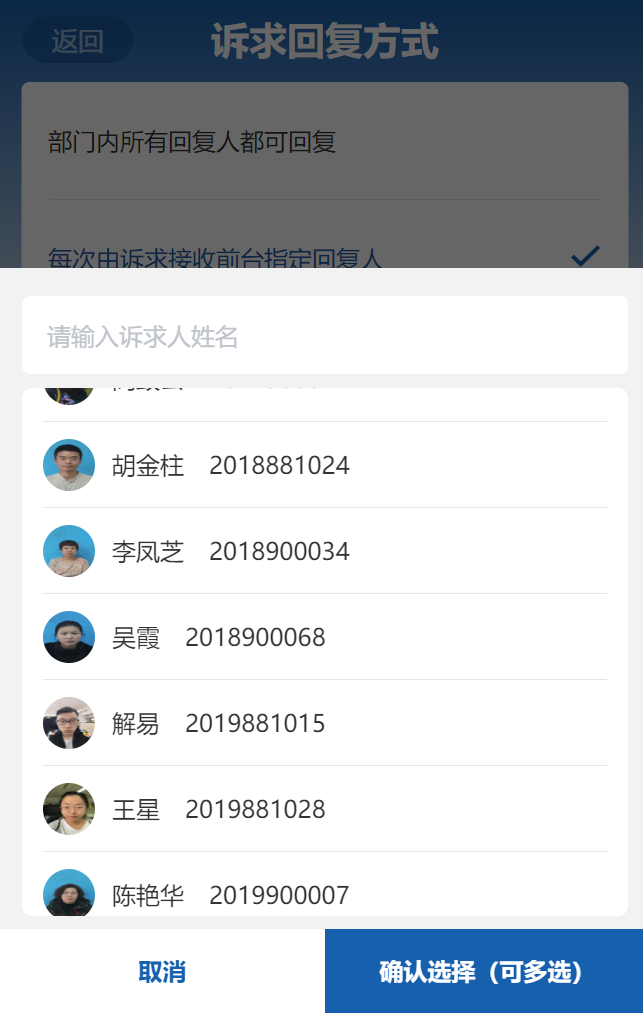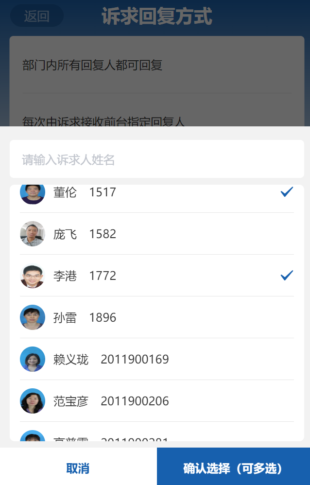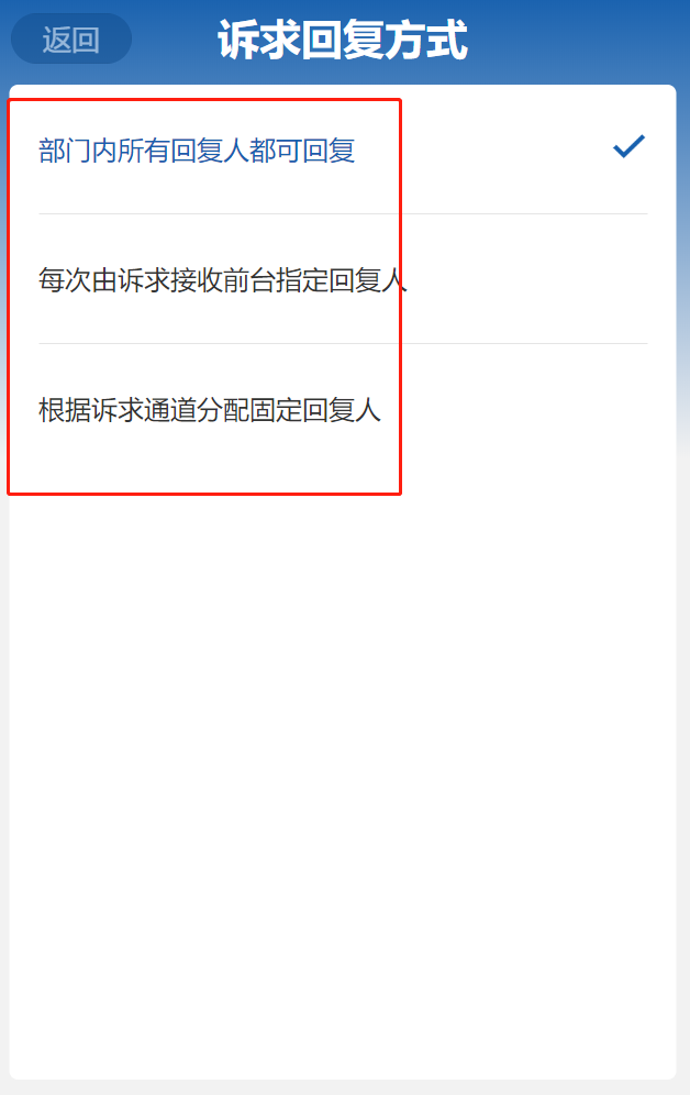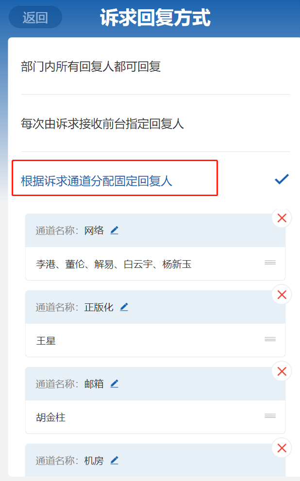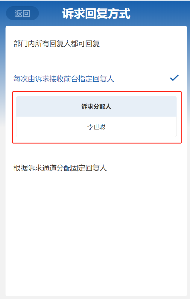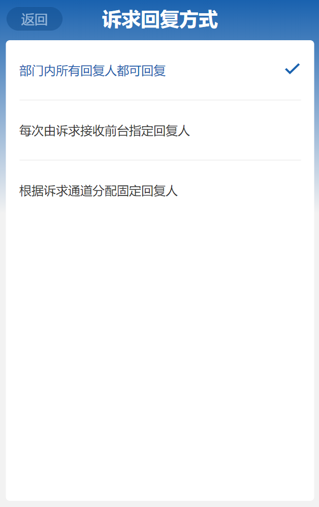 1)部门内所有回复人都可回复:选择这种模式需要在管理员添加一个或多个诉求回复人,这些诉求回复人都可回复部门下未回复的诉求。