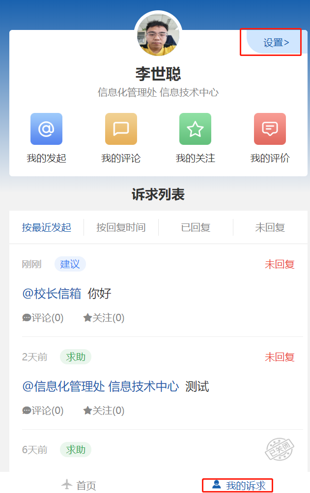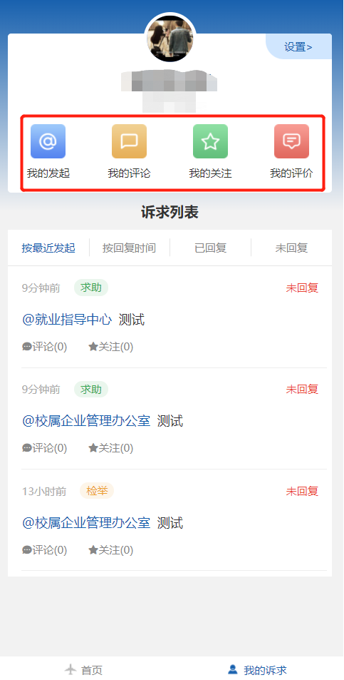 首页进入【我的诉求】,点击上方即可完成对【我的发起】、【我的评论】、【我的关注】、【我的评价】的查看。