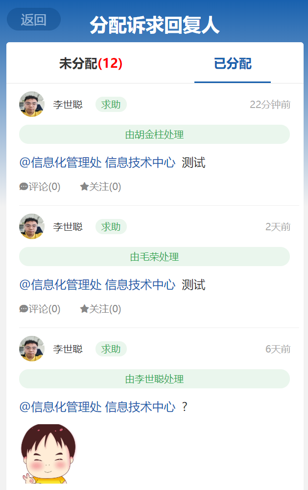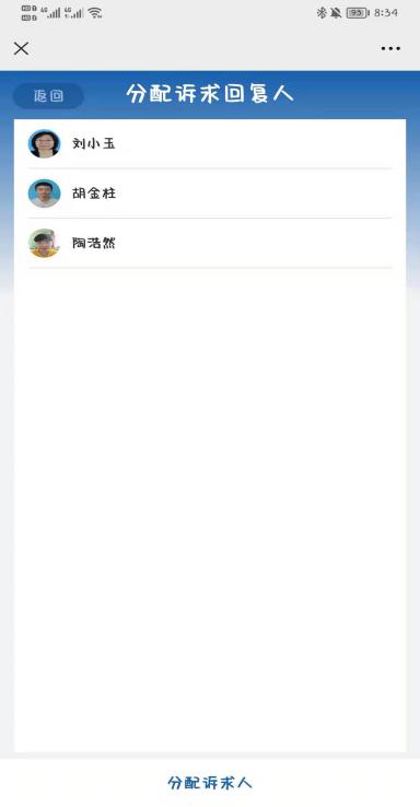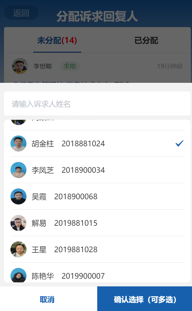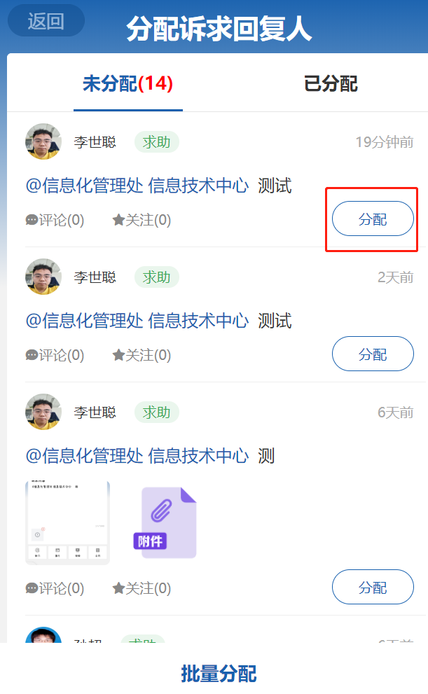 2)每次由诉求接收前台指定回复人:选择这种模式要添加诉求分配人,被添加为诉求分配人的管理员,首页会新增【分配诉求】模块,进入该模块后会展示部门下未回复的诉求,诉求分配人需要将每个诉求分配给对应的诉求回复人,可将诉求批量分配给某个/多个诉求回复人。