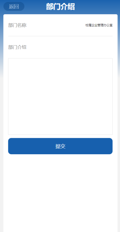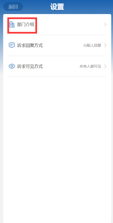 点击设置进入到部门设置页面,再点击部门介绍,即可编辑部门信息,用户在发起诉求选择部门时可以看到部门介绍。