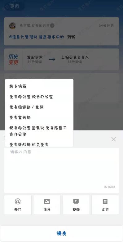 在首页点击【部门管理的诉求】,将展示部门下所有的诉求情况包括待处理、进行中、已结束、评价,点击可查看诉求并回复,回复内容@其他部门即可完成转交。