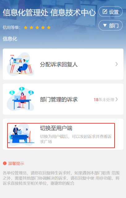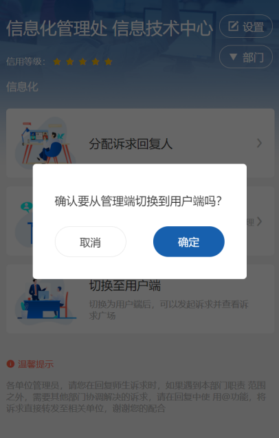 管理员状态时想切换至用户端,在首页点击【切换至用户端】即可。用户端时想切换至管理端,点击【去回复】即可。
