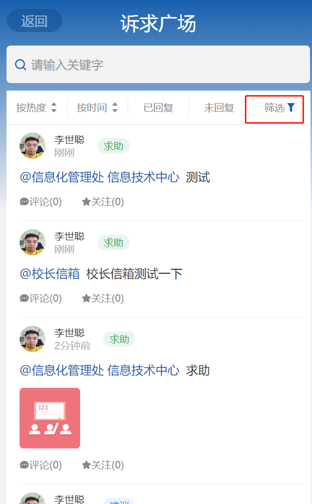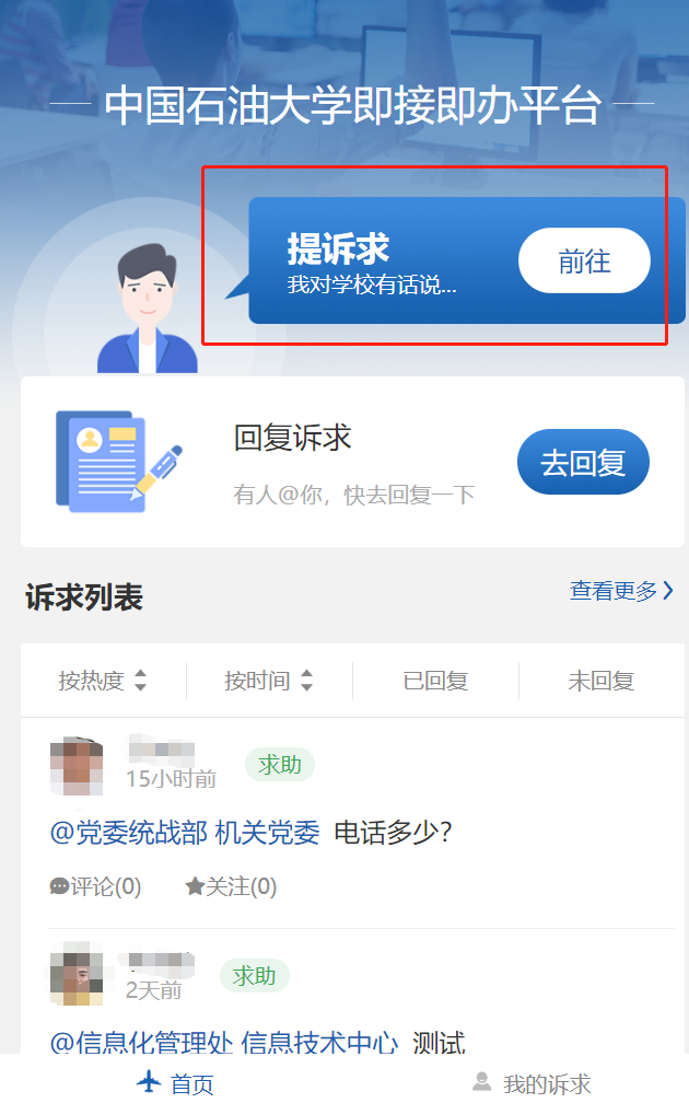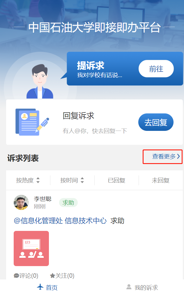 首先进入首页,下方即展示各类诉求,我们可以对诉求进行评论和关注,还可点击查看更多,根据不同条件对展示的诉求进行筛选展示。目前仅展示本人发起的诉求。