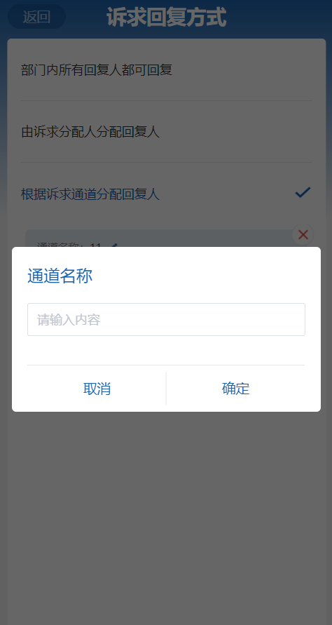 3)根据诉求通道分配回复人:选择这种模式要设置通道名称,每个通道设置对应得回复人。选择该模式后用户@本部门提交诉求时会出现通道选择弹窗,用户选择某一通道后,系统自动将诉求分派给通道内得诉求回复人。