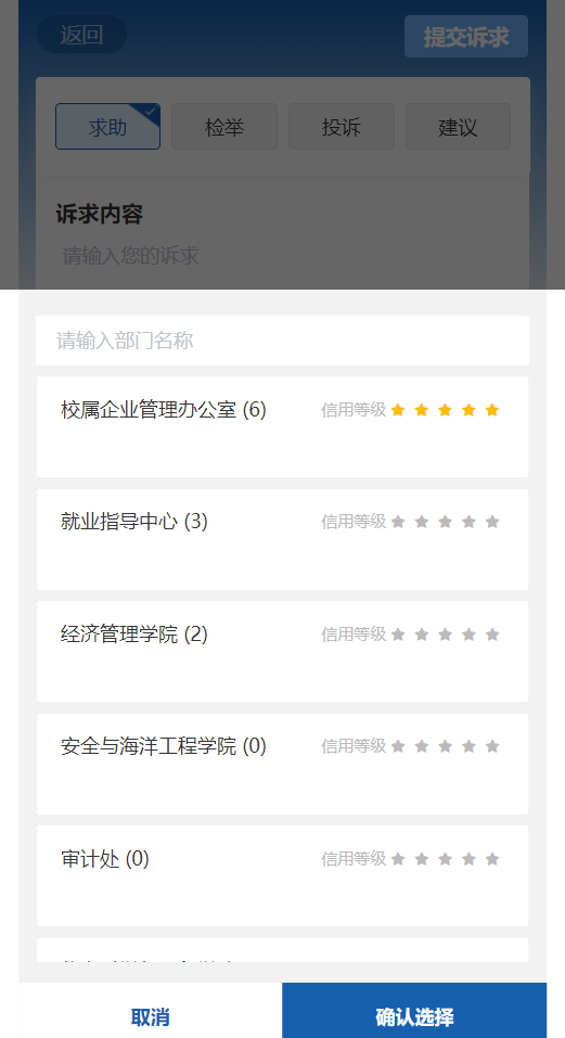 3)点击【确认选择】并填写完诉求内容后,点击右上角提交诉求,则诉求发布成功。若该部门设置通道功能则页面会自动跳转到【通道选择】选择问题相应得通道后完成诉求发布。