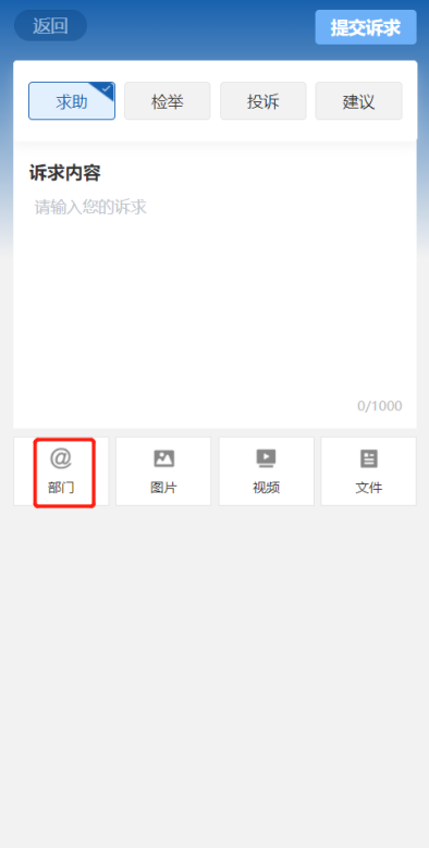 2)点击【前往】后,会跳转到发布诉求页面,在这里我们可以输入我们的诉求,选择诉求类型并@相关部门进行解决,填写诉求时我们可上传照片或附件。