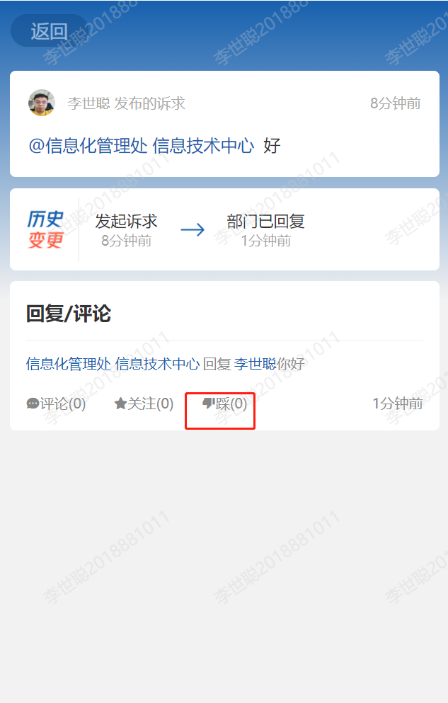 可进入【我的诉求】页面,点击【已回复】选择不满意的诉求回答,进入诉求详情页面,点击【踩】即可重启诉求