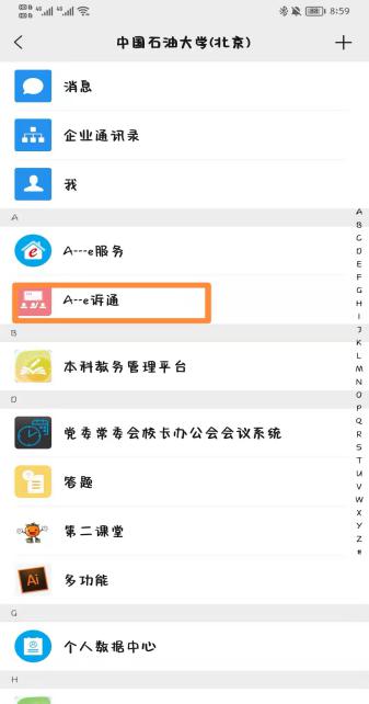 在微信通讯录中进入中国石油大学(北京)企业号,点击进入【e诉通】应用。