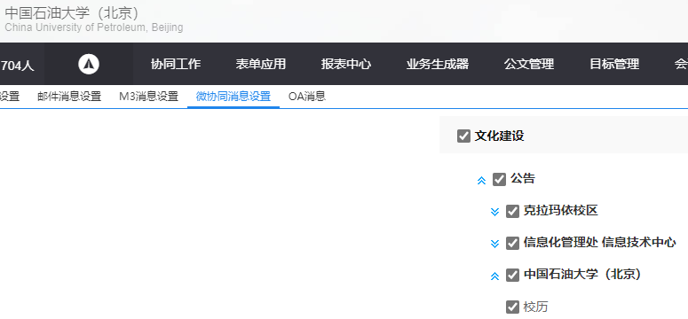 (3)微信企业号“微协同”端—— 点击左上角切换到“微协同消息设置”,再次下滑找到“文化建设”,点击“公告”左侧下拉箭头展开,再点击“中国石油大学(北京)”左侧的箭头。找到不想接收消息提醒的栏目,取消栏目前面的勾选框,鼠标滑动至页面最底端,点击“确定”即可保存针对微信端微协同的消息设置。
