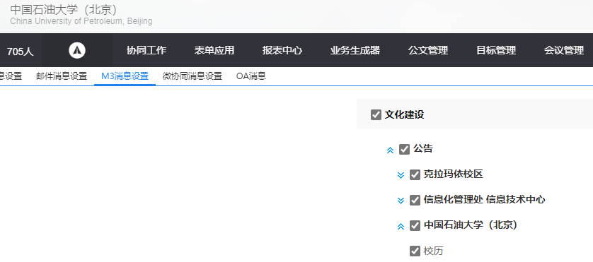 (2)手机APP端——点击左上角切换到“M3消息设置”,再次下滑找到“文化建设”,点击“公告”左侧下拉箭头展开,再点击“中国石油大学(北京)”左侧的箭头。找到不想接收消息提醒的栏目,取消栏目前面的勾选框,鼠标滑动至页面最底端,点击“确定”即可保存移动端APP的消息设置。