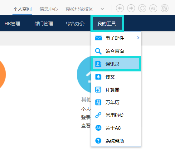 在【我的工具】 --【通讯录】 --为完善全校通讯录,登陆 OA 后,点击菜单栏右上角灰色齿轮设置按钮,选择【个人设置】 --【个人信息】,完善个人信息。以便完善全校通讯录。在手机 app 上可以直接拨打电话,发信息。