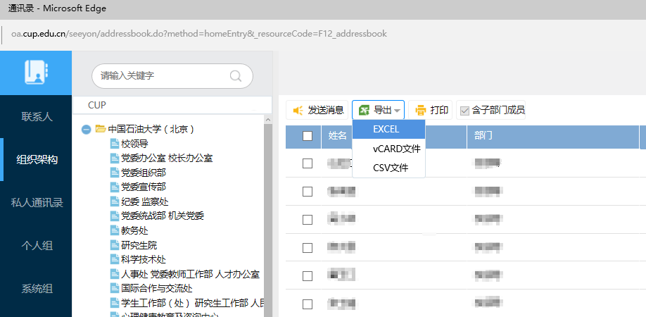 为导出通讯录准确完整,需要完善全校通讯录。因此,在登陆 OA 后,点击菜单栏右上角灰色齿轮设置按钮,选择【个人设置】 --【个人信息】,完善个人信息。
