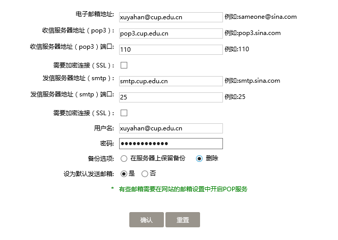 第二步 邮箱配置如下。系统可设置多个邮件域,新建邮箱时如果设为默认发送邮箱,以后发送邮件就会以这个邮箱作为发信邮箱。电子邮件地址为个人要设置的邮箱地址,用户名和密码为设置邮箱的用户名及密码,备份选项选择“删除”。