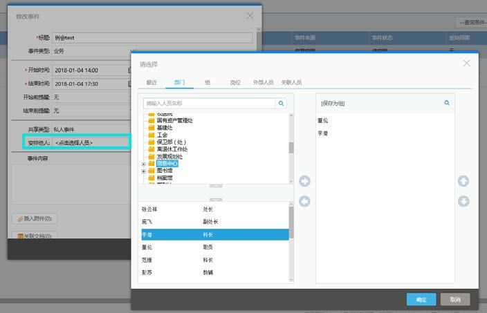 新建日程后, 用户还可将事件安排给他人执行。从选人列表中选择一个或多个用户。事件建立后,该事件的所属人即为被安排人,该事件为【安排事件】 。